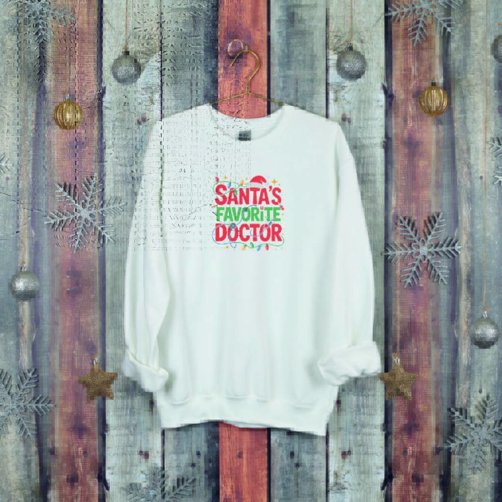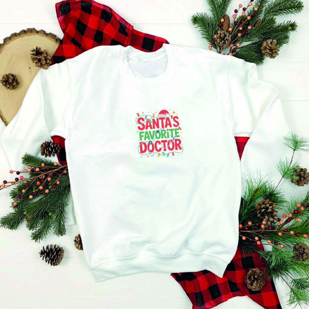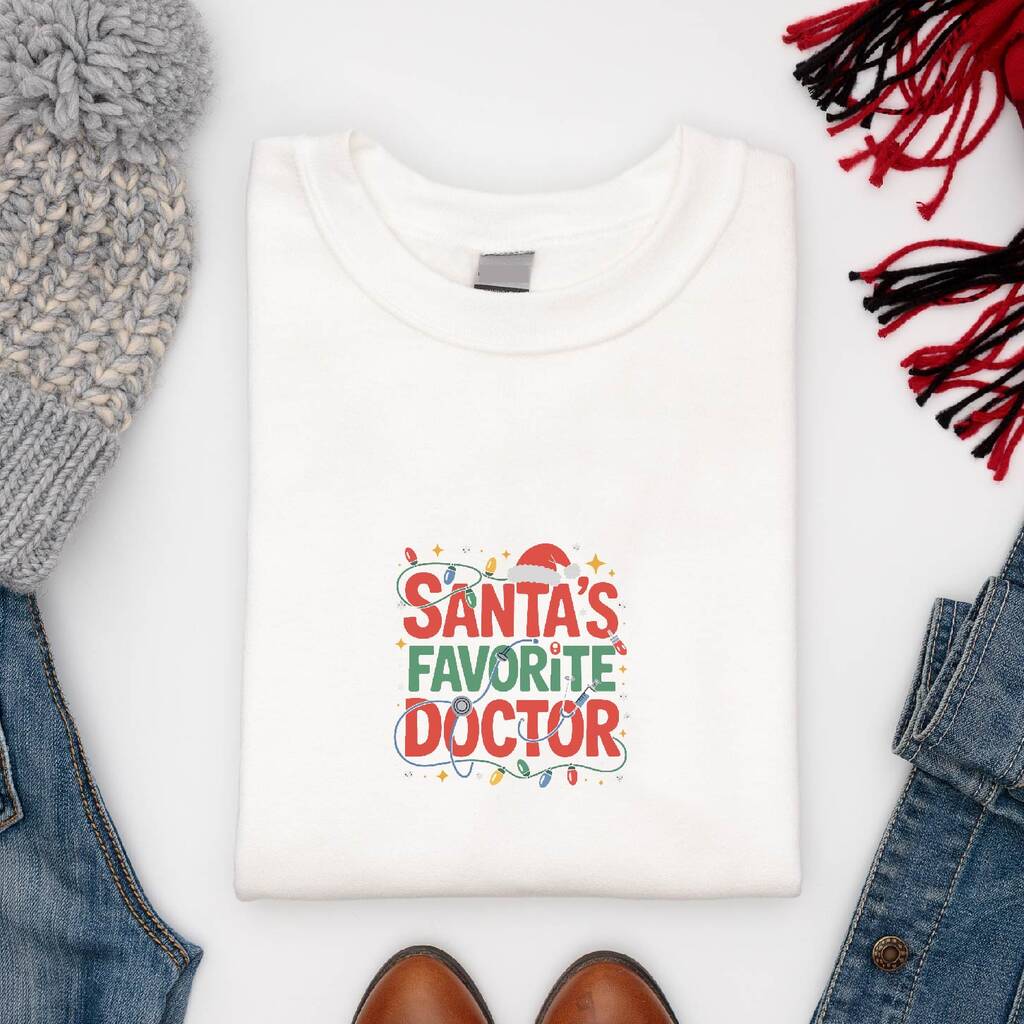 Celebrate the season in style with this fun white Christmas jumper featuring a colourful “Santa’s Favourite Doctor” design the perfect festive gift for healthcare heros.
