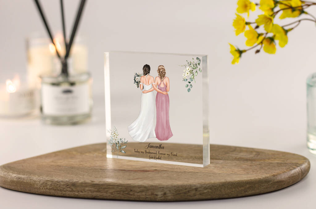 A sentimental personalised acrylic block with floral detail – the perfect bridesmaid proposal or thank-you gift for your bridal party.