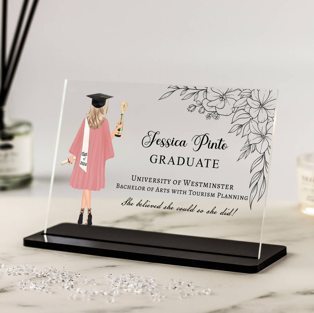 Celebrate her graduation with this personalised acrylic plaque, featuring a female graduate illustration, floral decoration, cursive text, and a celebratory scroll and champagne bottle.