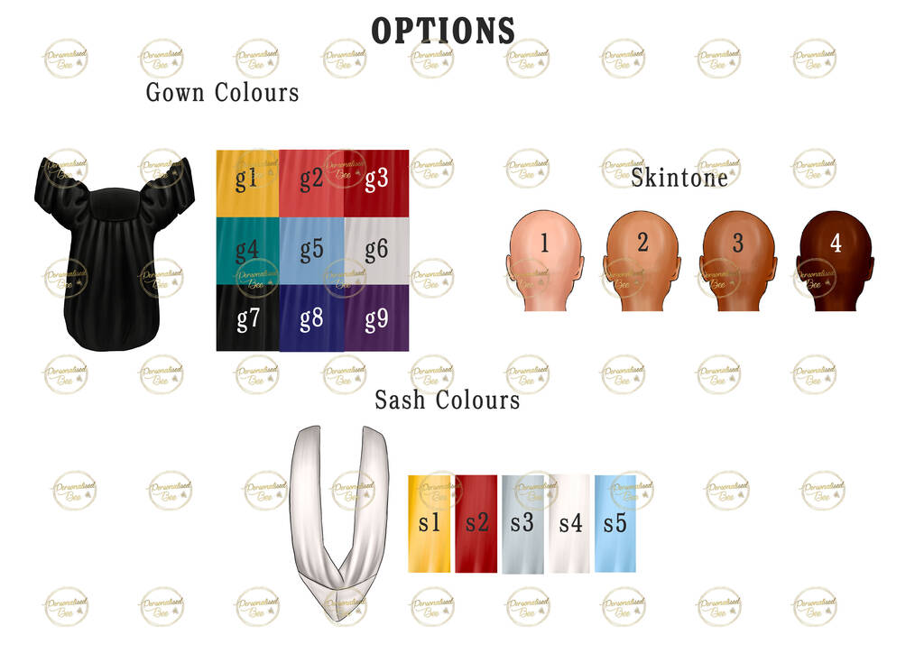 Choose from a selection of hairstyles, hair colours, skin tones, and gown colours for a close likeness to the recipient.