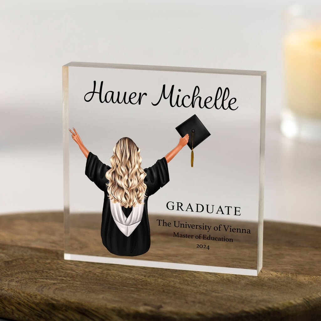 Capture the excitement of her big achievement with this beautiful personalised female graduate acrylic block — a joyful keepsake that celebrates her success in style.