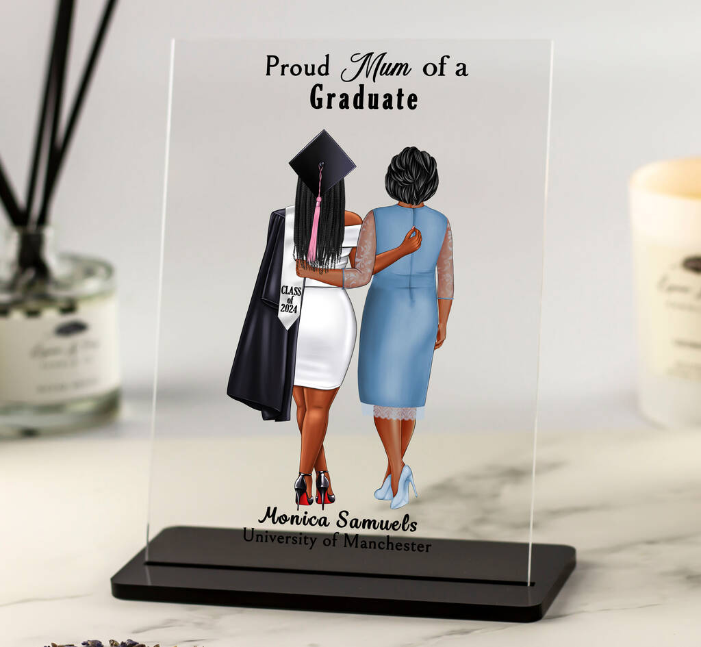 Celebrate a special graduation with this personalised acrylic plaque, featuring a mother and her daughter in gown, sash, and hat, with names and custom details.