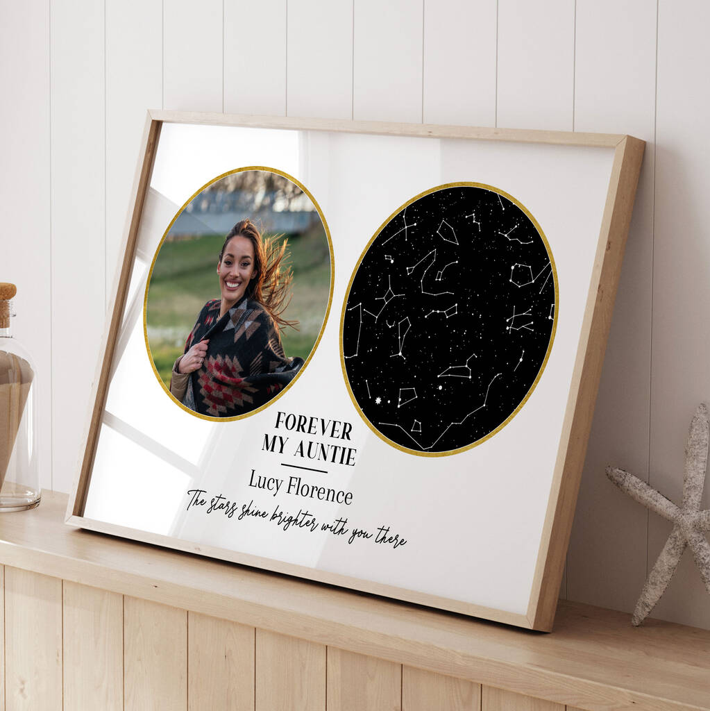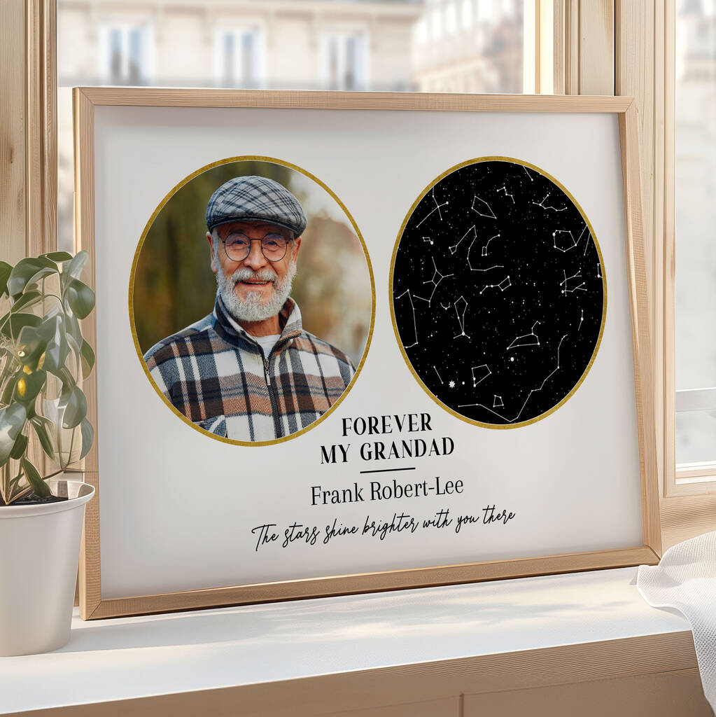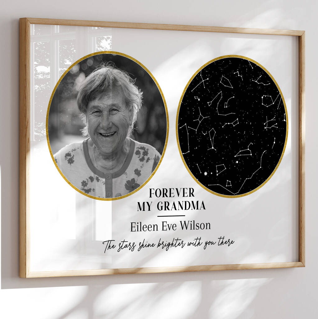 Keep their memory shining bright with this personalised star map memorial print, featuring a custom star chart and cherished photo. The stars reflect the night sky from a chosen date and place, symbolising the everlasting connection between you and your loved one. A touching way to remember mum, dad, nan, grandad, child, or friend, this keepsake brings comfort during the festive season and beyond. Perfect as a Christmas sympathy gift or remembrance print, each design is crafted with care to honour the light they brought into your life.