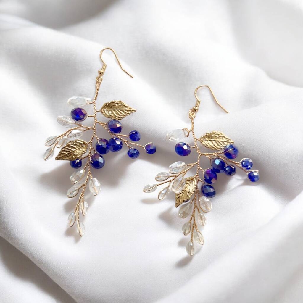 Blue Crystal And Gold Leaf Earrings