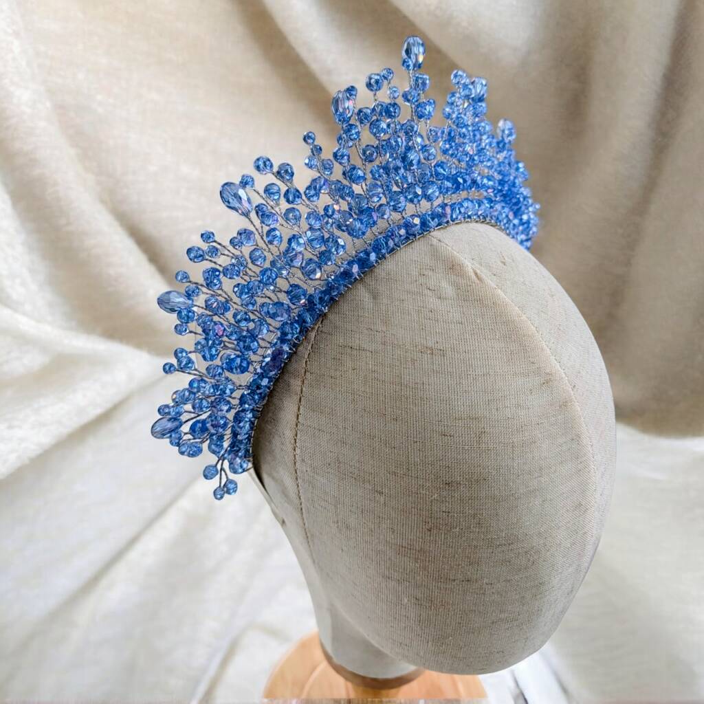 Perfect for those searching for a blue crystal crown, bridal headpiece, wedding hair accessory or statement crown, this design adds a magical finishing touch to any outfit.