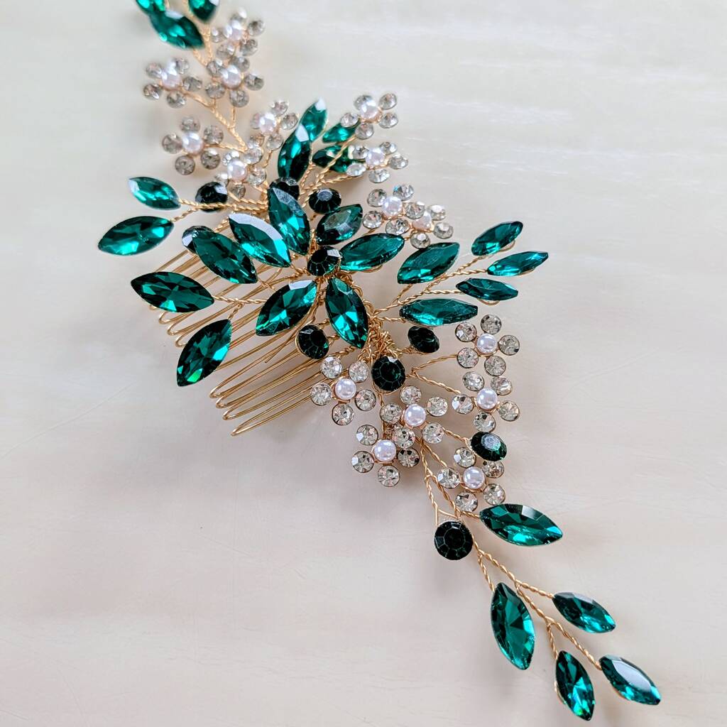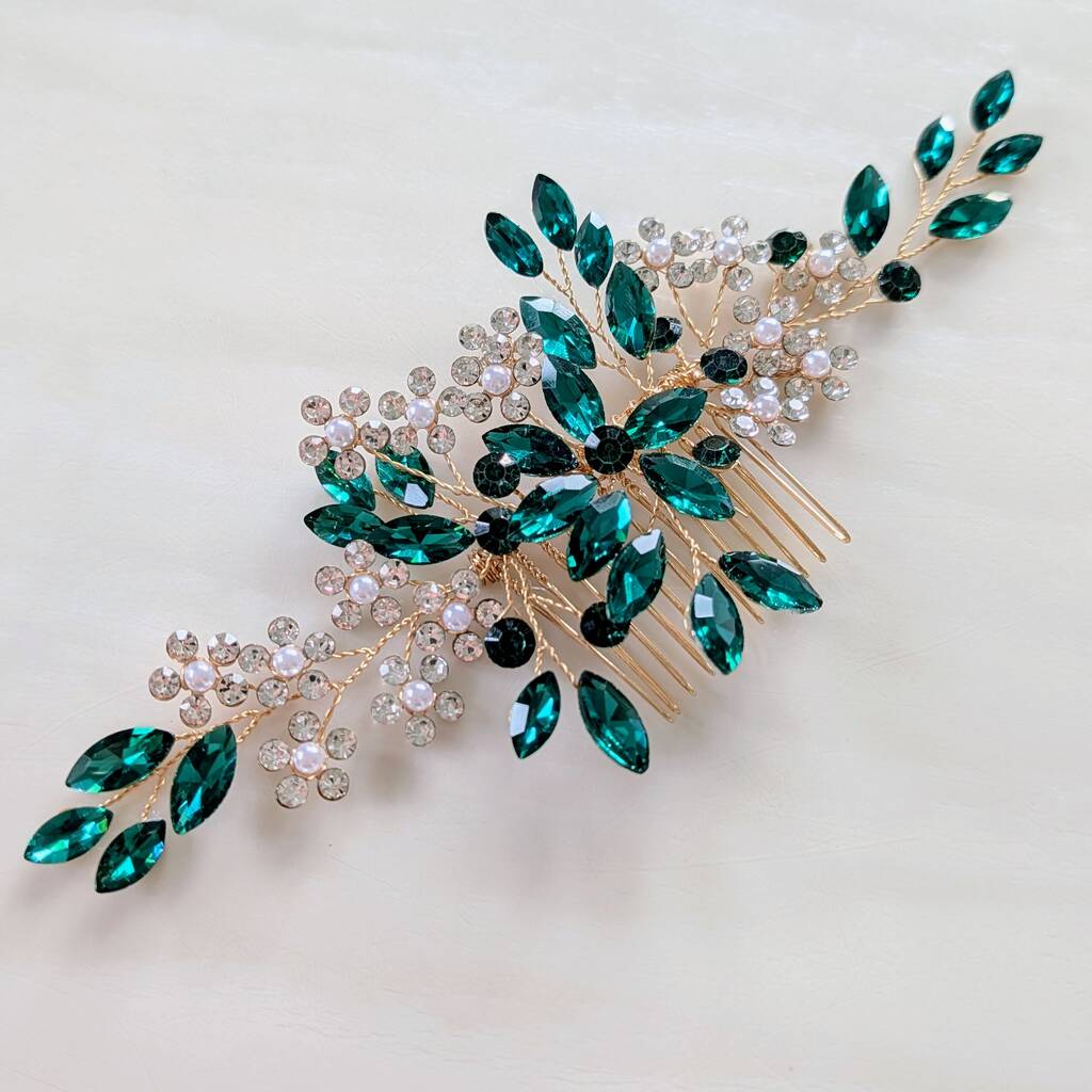 Handmade with care, this crystal hair comb is perfect for winter brides, bridesmaids, Christmas parties, holiday events, proms, or as a meaningful gift for her. Lightweight and easy to wear, it slips effortlessly into updos, half-up styles or loose waves, adding instant sophistication and a striking pop of green.