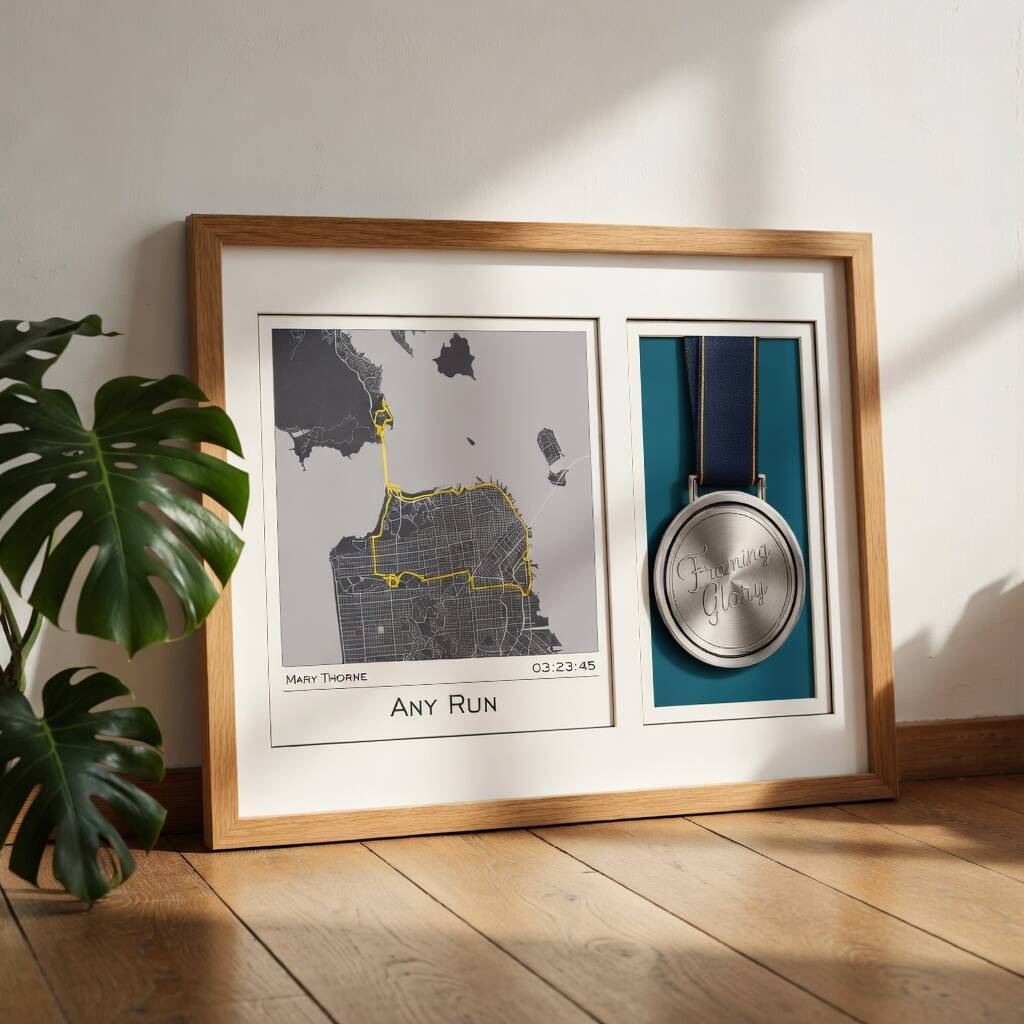 This personalised any run medal and map display frame is handcrafted in the UK using premium archival materials designed to create a beautiful, long-lasting keepsake that runners will treasure for years.