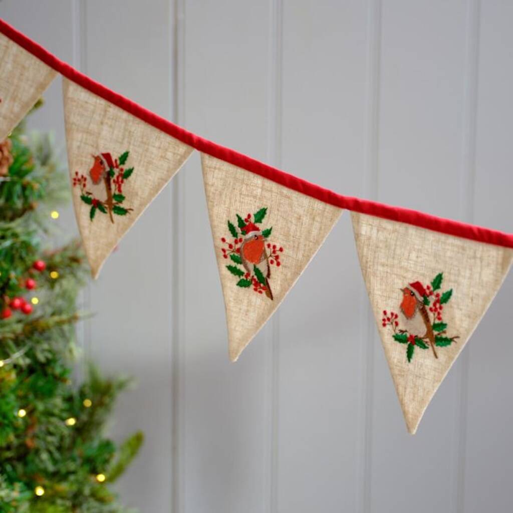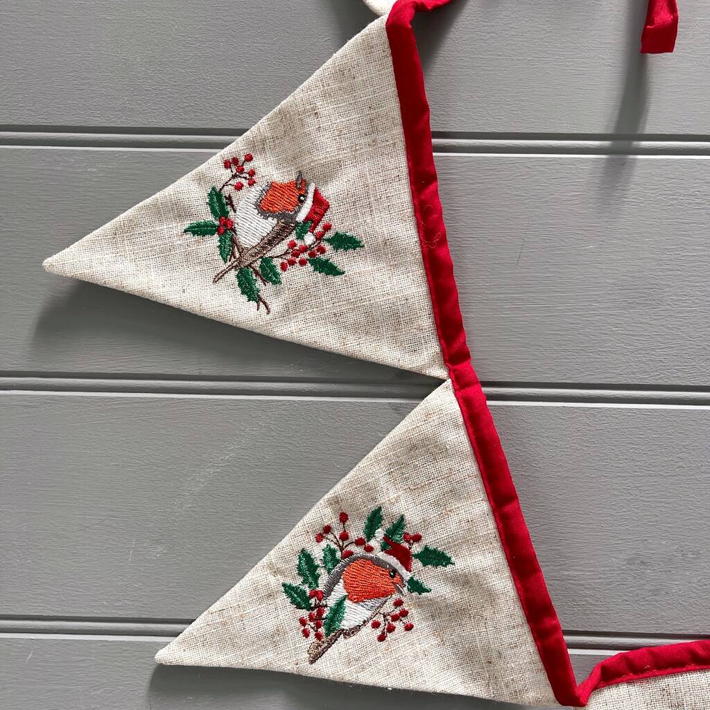 Christmas Robin Embroidered Linen Bunting