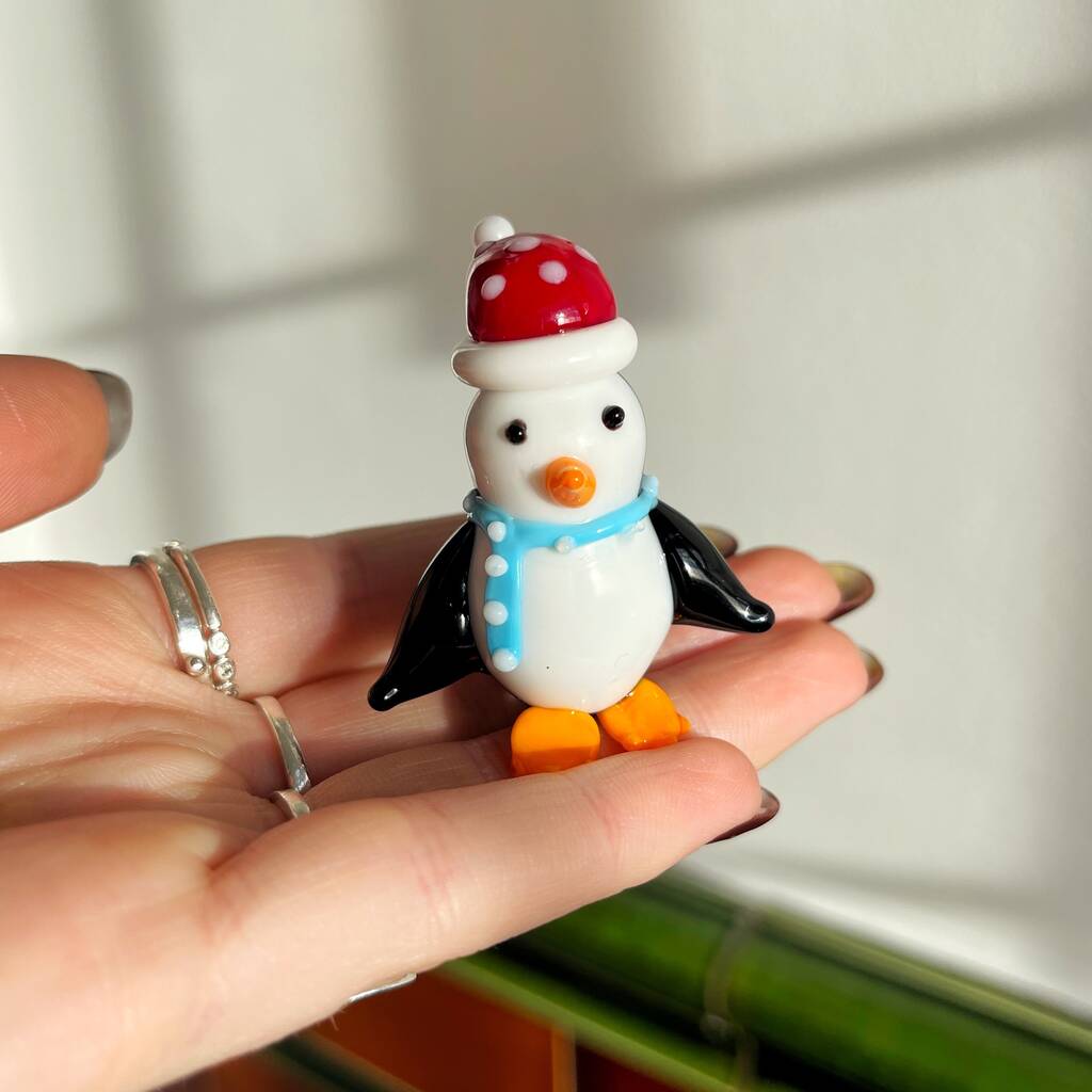 Hand Blown Tiny Glass Penguin With Santa Hat