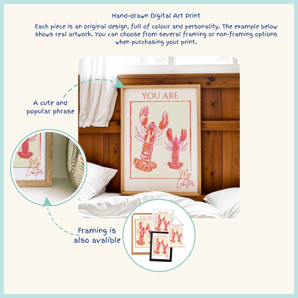 The heartfelt phrase "You Are My Lobster," displayed in mixed typefaces, makes this artwork an ideal romantic gift for anniversaries, weddings, Valentine’s Day, or any occasion to celebrate love.