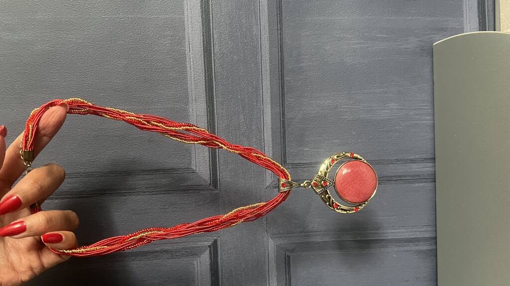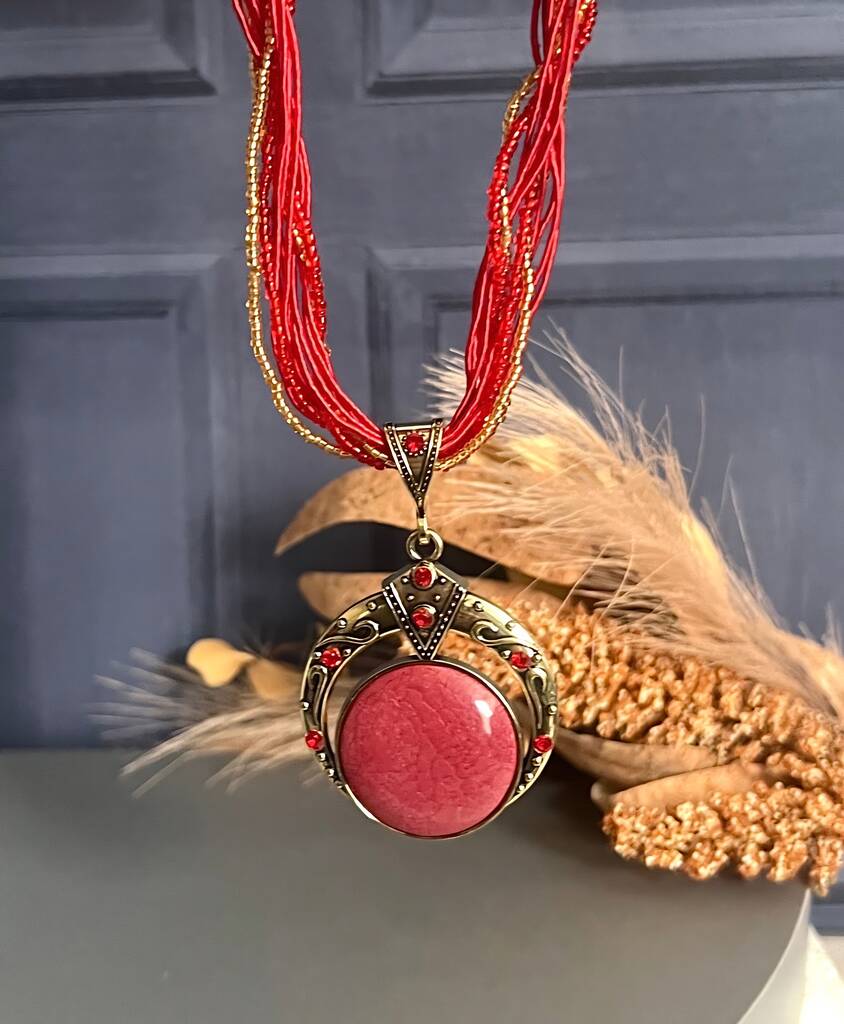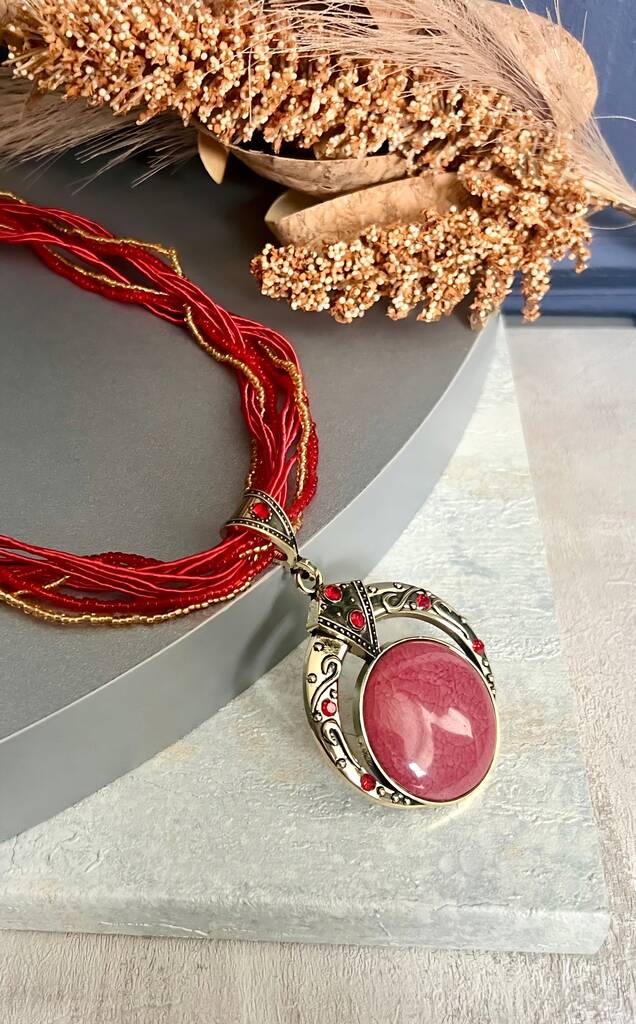 A stunning red multi stranded necklace featuring a red marbled pendant . Beautiful statement piece adding a pop of colour to your outfit.Make a statement with this stunning bohemian necklace, featuring a vibrant red braided cord and an intricately detailed pendant. The centerpiece is a large marbled red stone, framed in an antique silver-tone setting adorned with shimmering red rhinestones. The multi-strand cord combines seed beads, satin strands, and gold accents for a rich, layered texture that catches the light beautifully.