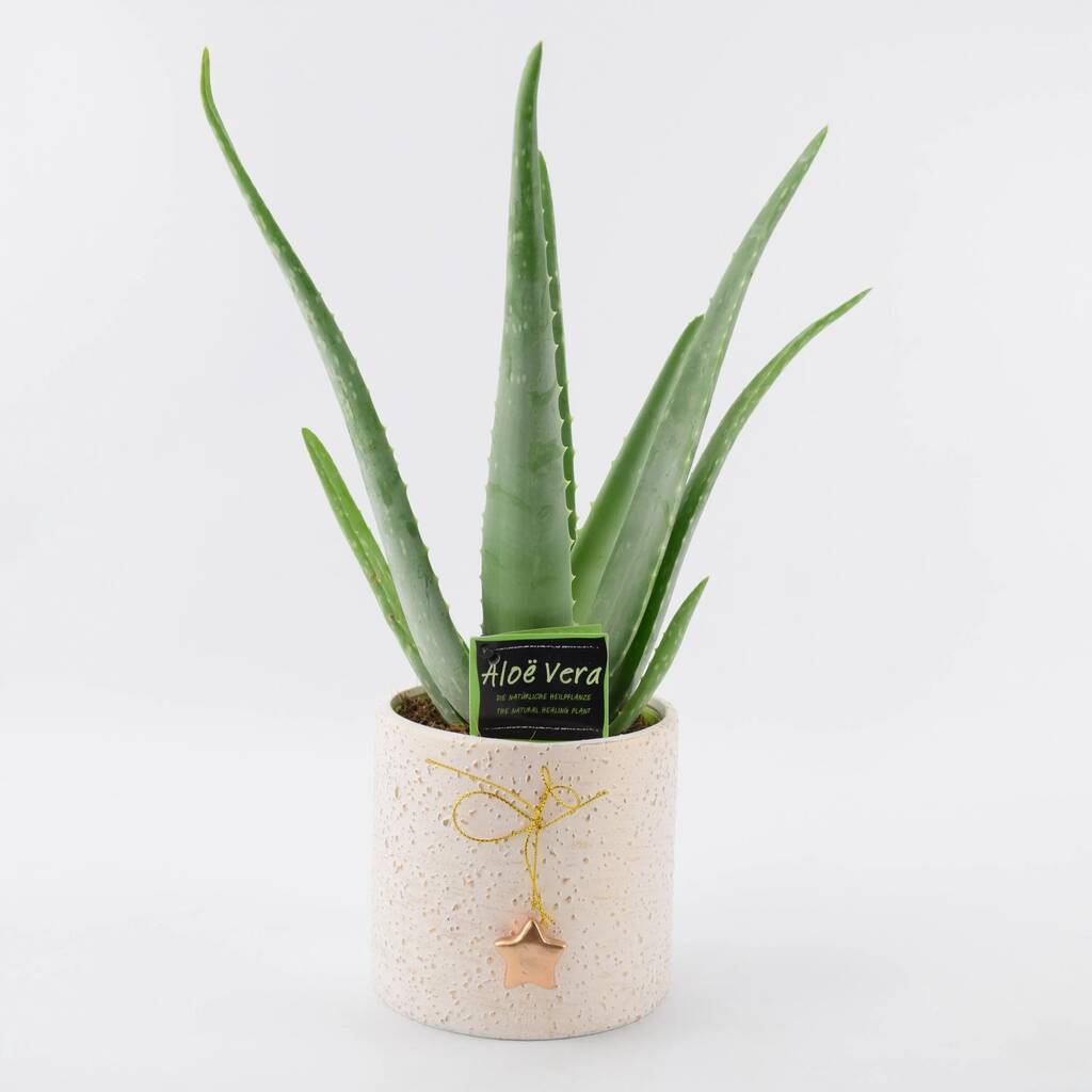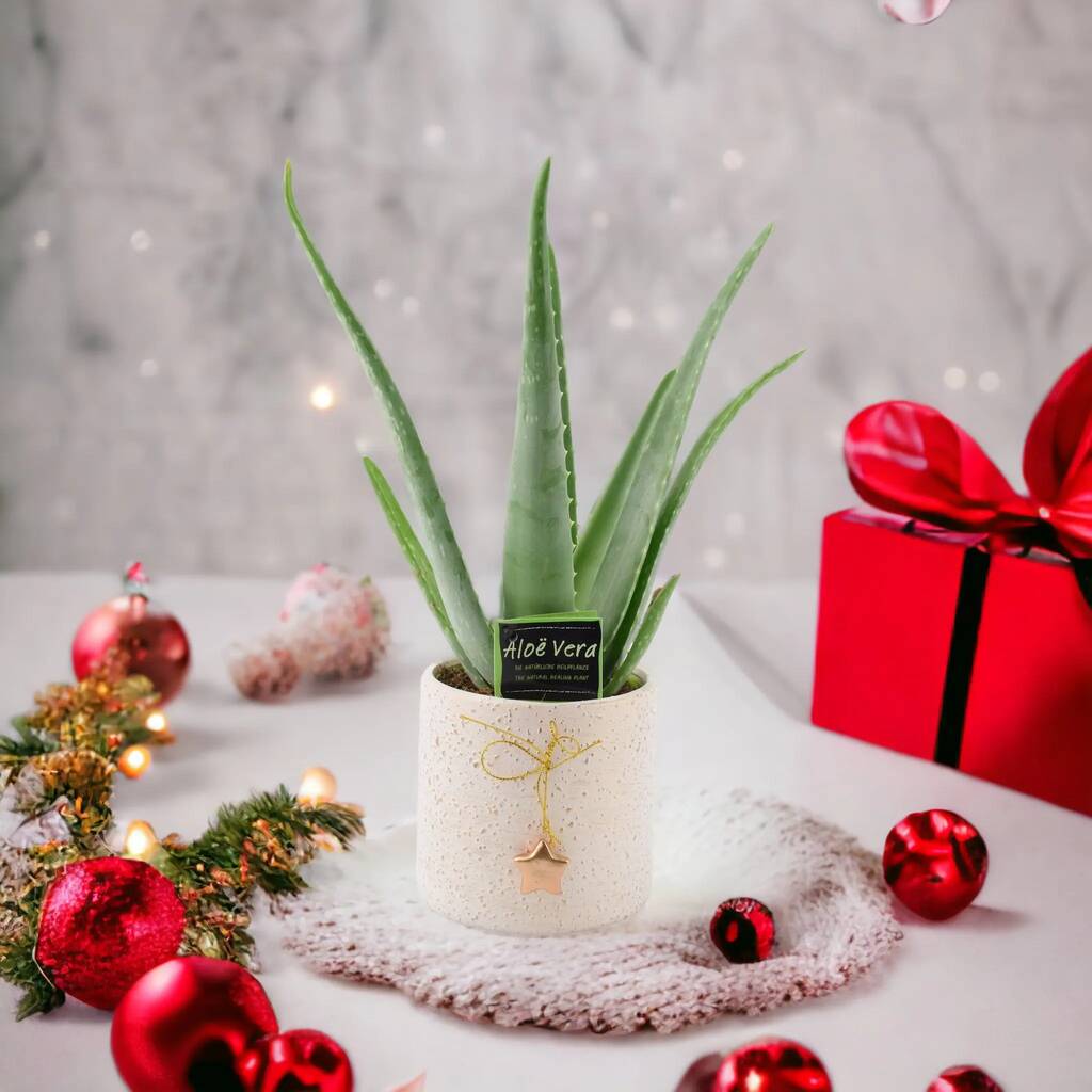 The ceramic pot features a festive cream base colour accented with gold stars, offering a tasteful seasonal look that works year-round. Lightweight yet sturdy, the pot provides proper drainage and supports the Aloe Vera's root system.