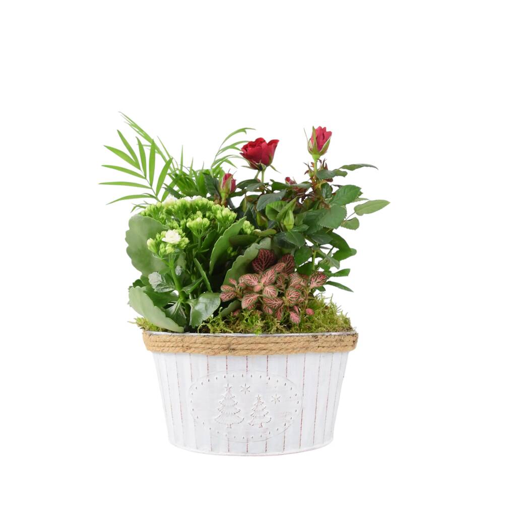 When planted, the total height of the arrangement is approximately 25–35cm, depending on plant maturity and seasonal availability. The zinc pot features subtle festive detailing and rustic character, finished with a natural moss topping for a refined and festive look.