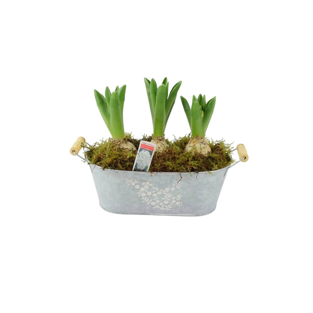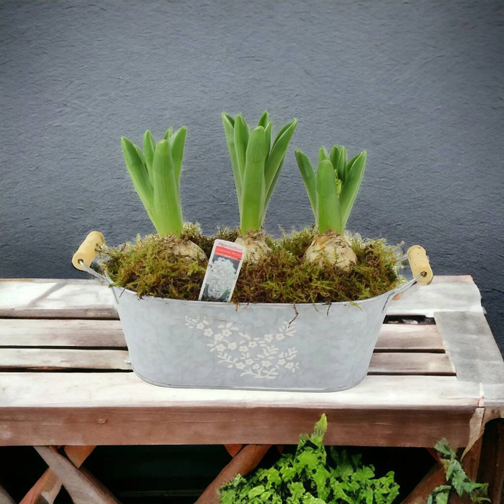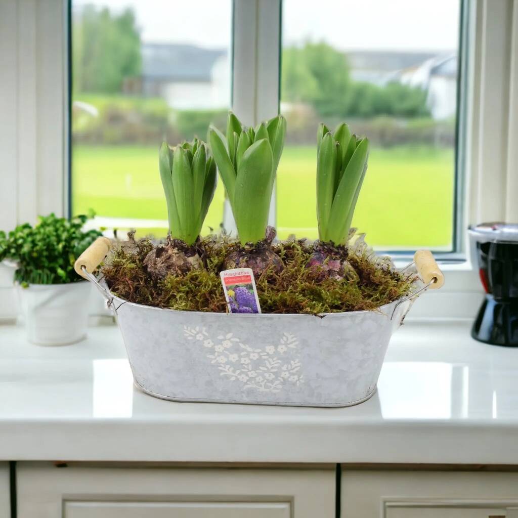 The Potted Hyacinth Spring Trough includes three premium hyacinth bulbs pre-planted in a decorative metal planter. The trough measures approximately 25–30 cm in length, 10–12 cm in width, and stands around 12–15 cm tall, not including the plant growth. With the hyacinths in bloom, the total height can reach up to 30 cm.