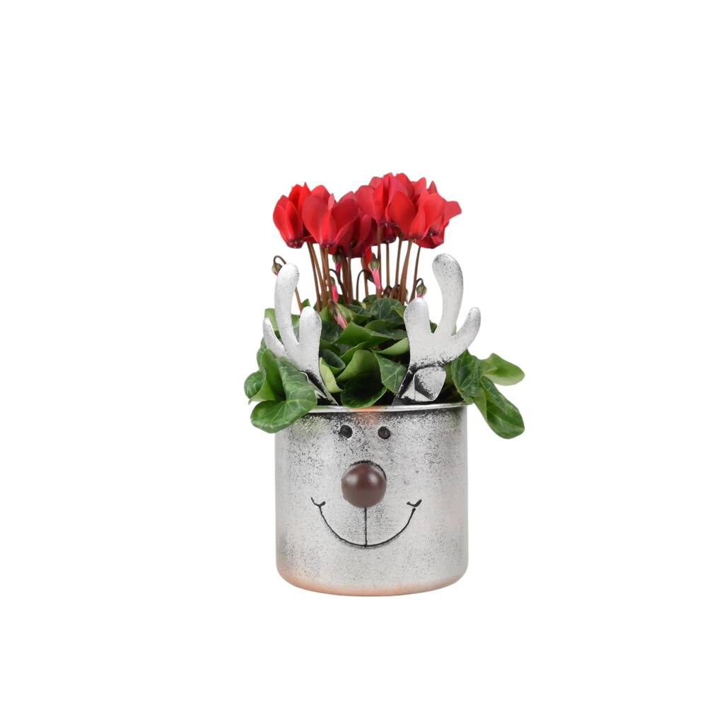 Each planter includes a nursery-fresh cyclamen, available in red or white, chosen for its ability to thrive in cooler indoor and outdoor environments. Cyclamen are known for their vivid petals, attractive heart-shaped leaves, and easy-care nature, making them ideal for gifting and decorating alike. The plants are nestled into a compact pot section within the reindeer body, ensuring they’re both stable and visible, adding a beautiful pop of colour to your festive arrangement.