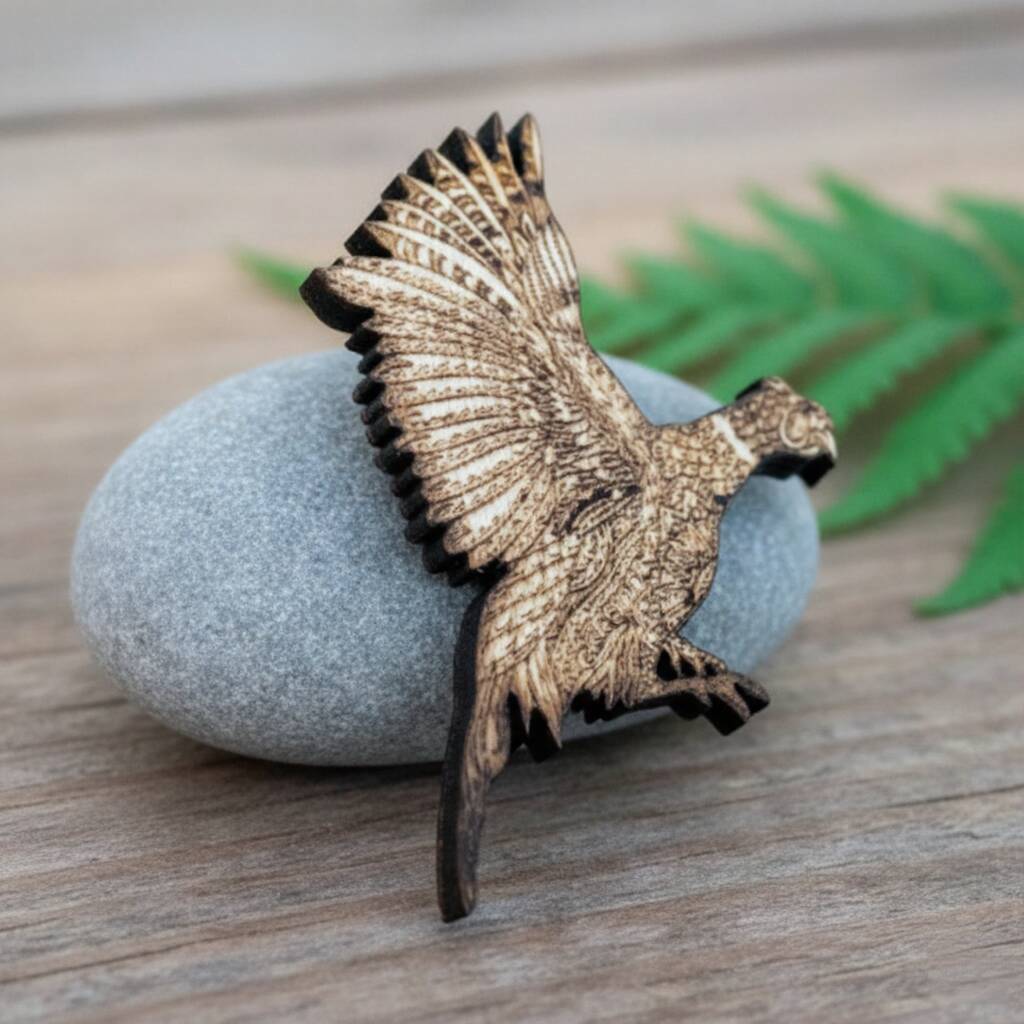 An engraved wooden pheasant badge, crafted from natural wood and inspired by the countryside, perfect for adding a rustic touch to jackets, bags, or hats.This engraved wooden pheasant brooch is crafted from natural wood and inspired by the British countryside. Lightweight and easy to wear, it’s perfect for jackets, bags, or hats. A charming accessory for nature lovers, it also makes a thoughtful gift for anyone who likes country pursuits, woodland-inspired design.