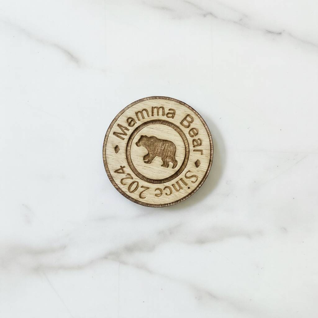 A charming wooden badge engraved with a mama bear and personalised with a meaningful year, perfect for celebrating motherhood and special memories.Celebrate the strength and love of motherhood with this beautifully crafted wooden badge. Engraved with a sweet mama bear design and personalised with the year you became a mum, it’s a thoughtful keepsake for mums, mums-to-be, or anyone embracing their inner mama bear. Made from natural wood with a smooth finish, each badge has its own unique grain, making every piece one of a kind. Perfect as a Mother’s Day gift, baby shower present, or a small token to mark a special moment in time.