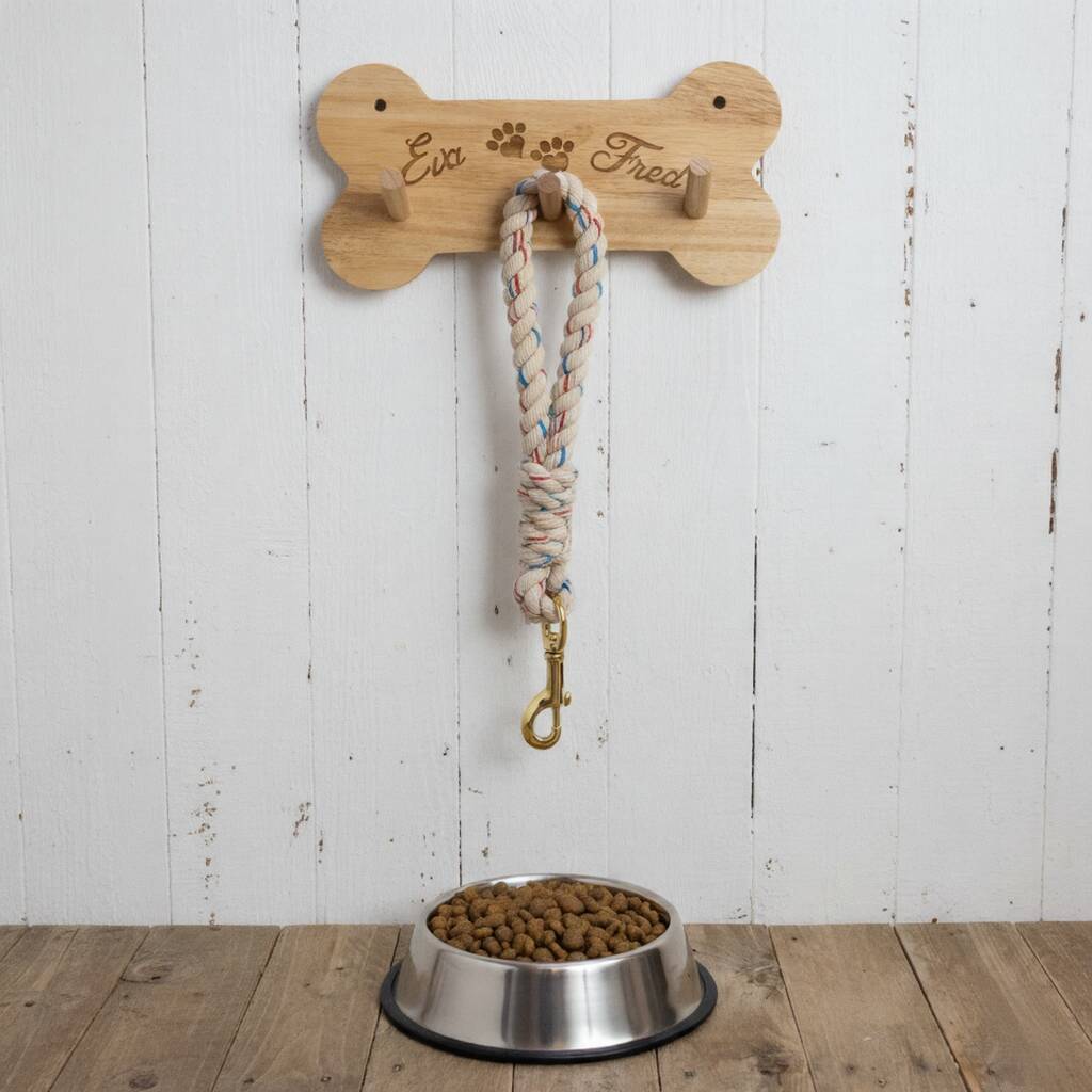 A wooden bone-shaped dog lead holder, personalised with up to three of your dog’s names—perfect for keeping leads organised in style.This wooden bone-shaped wall dog lead holder with wooden hanging pegs. Crafted from natural wood, it can be engraved with up to three of your dog’s names, making it a unique and thoughtful accessory for any pet owner.