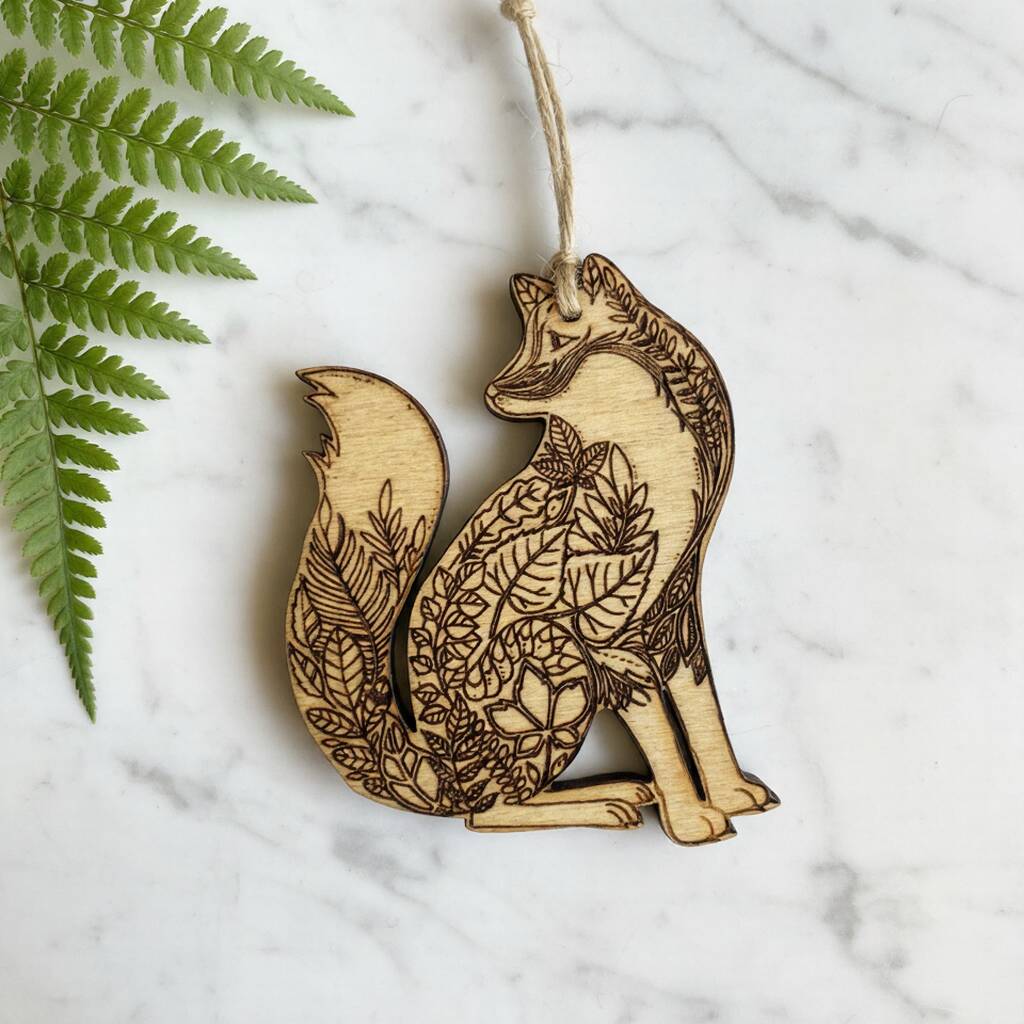 A charming wooden fox hanging decoration, engraved with a delicate foliage design to add a cosy woodland touch to your home décor.This charming wooden fox hanging decoration is engraved with a delicate foliage design, adding a cosy woodland touch to your home. Crafted from natural wood, it’s perfect for styling shelves, walls, or seasonal displays. A lovely accent for nature lovers, it also makes a thoughtful gift for any occasion.