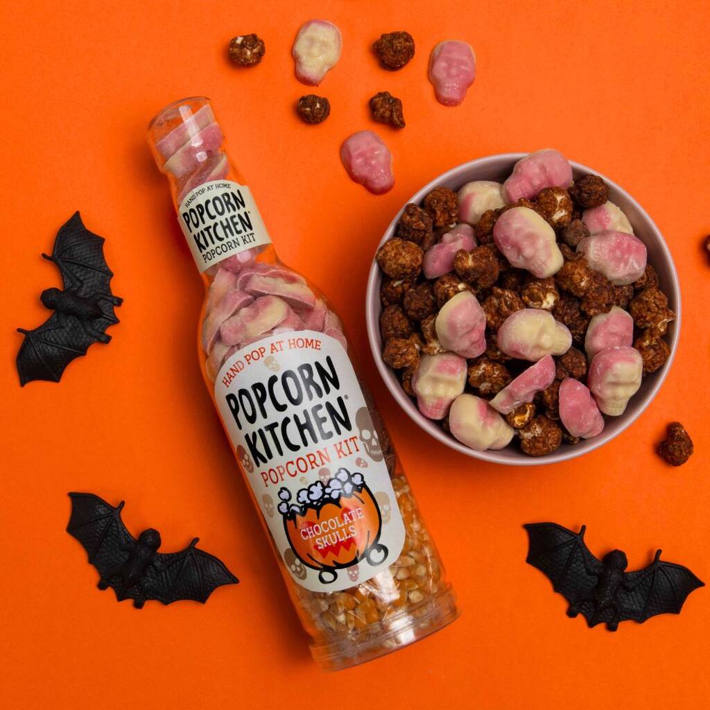Halloween Skulls Pop At Home Kit: Unpopped Corn, Strawberry and Cream Flavour Candy Skulls (31%) (Sugar, Vegetable Fat (Palm), Whey Powder (MILK),WHEAT flour (with Calcium, Iron, Niacin, Thiamin), Emulsifier: Rapeseed Lecithin, Natural Flavours, Natural Colour: Carmin, Chocolate Flavoured Buttons (Sugar, Vegetable Fat (Palm),Whey Powder (MILK), Fat Reduced Cocoa Powder, Whole MILK Powder, Emulsifiers (Sorbitan Tristearate, Sunflower Lecithin), Flavour.