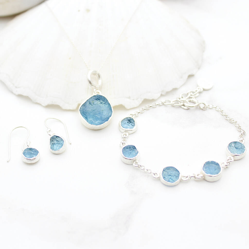 A beautiful aquamarine round gemstone bracelet, pendant and earrings jewellery set featuring natural rough cut Aquamarine gemstones in a brushed sterling silver setting.In a gorgeous shade of aquamarine (blue/green) and striking silver our Aquamarine designs are truly unique – due to the natural gemstones used each pendant/earring/bracelet will vary slightly in shape, size and shade but this ensures you will receive a beautiful and unique pendant.