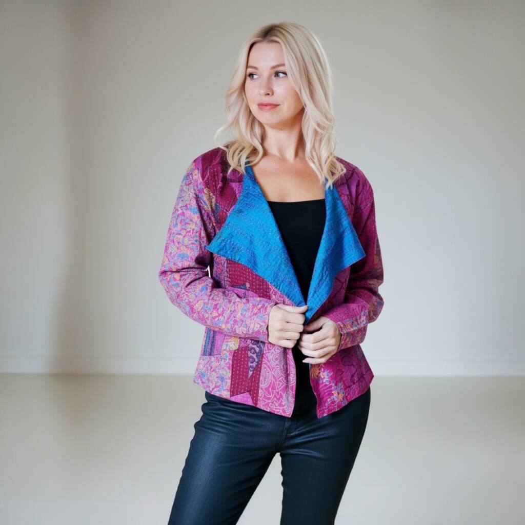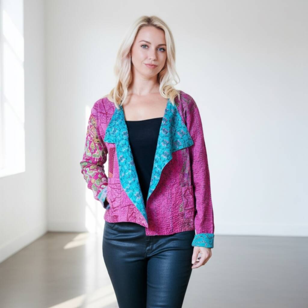 A beautiful one-of-a-kind soft, silk jacket made from silk saris, featuring vibrant pink and green or blue prints finished with lovely Kantha hand stitched detail.