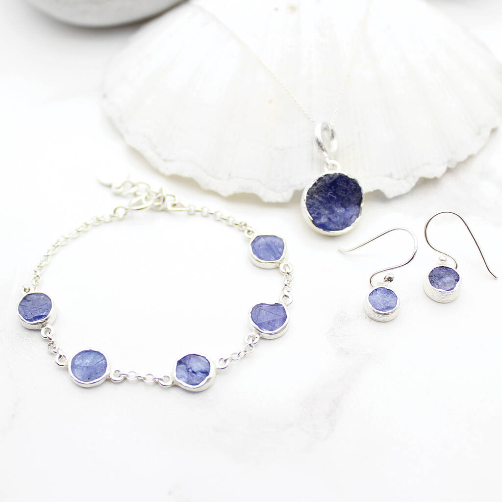 A beautiful Tanzanite round gemstone bracelet, pendant and earrings jewellery set featuring natural rough cut Tanzanite gemstones in a brushed sterling silver setting.Our designs & colours have been inspired by the Moray Firth sea and coastal area in NE Scotland.