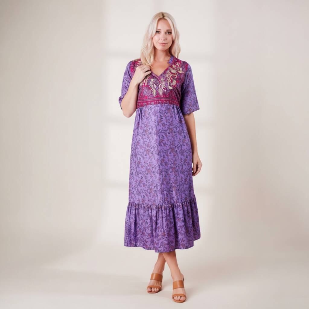 A beautiful one-of-a-kind embroidered purple silk print dress made from silk saris…
