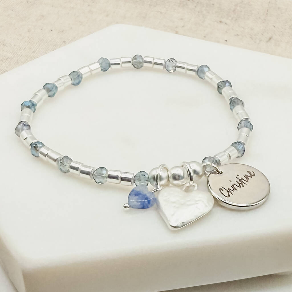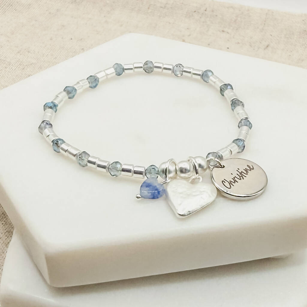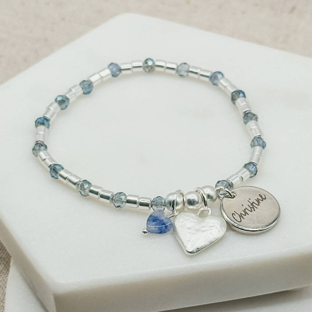 A beautifully delicate beaded bracelet made with soft blue crystals, silver-plated tubes and two meaningful charms — a hammered heart and a personalised engraved disc. Finished with a small blue gemstone heart, this bracelet is designed to be worn every day and cherished for years to come.