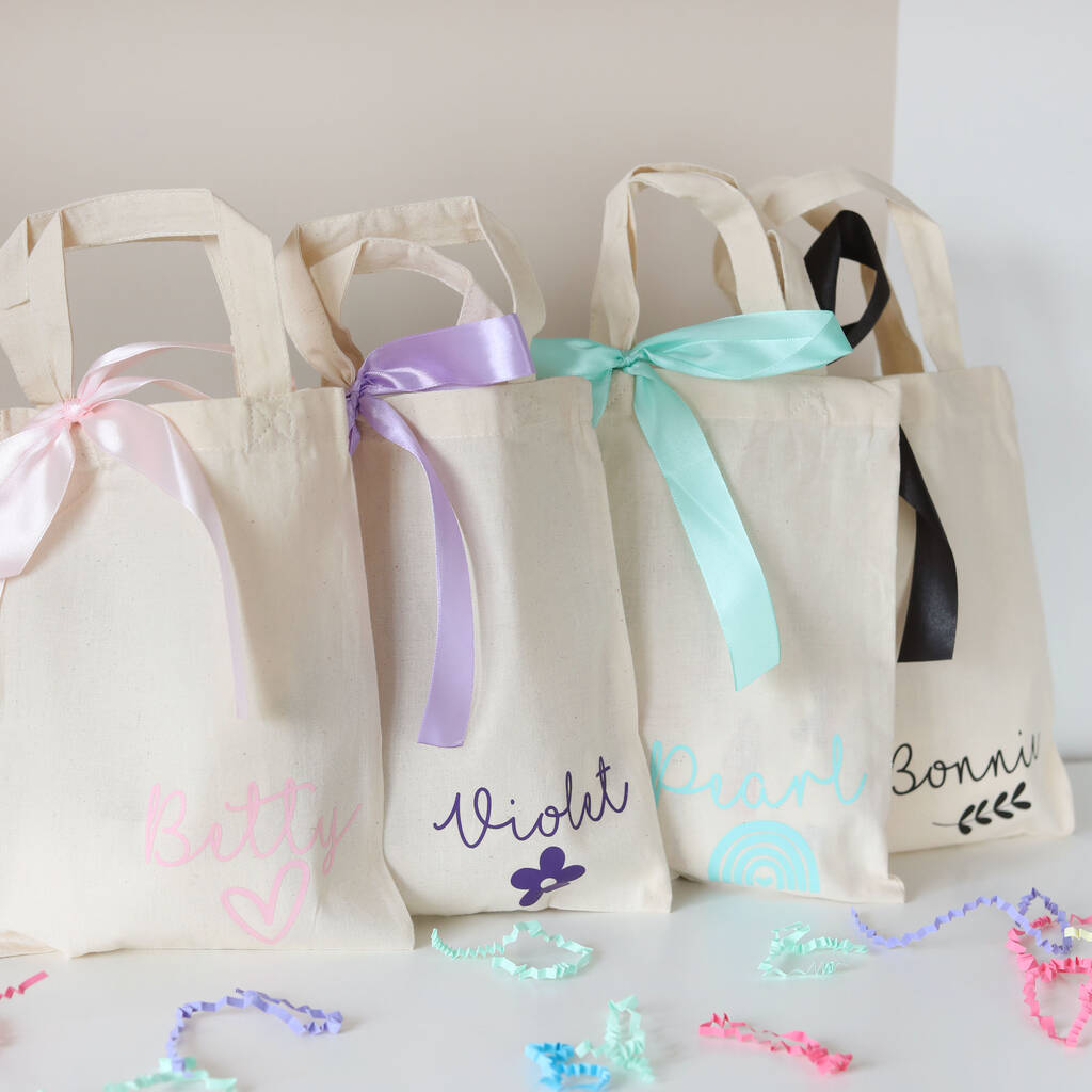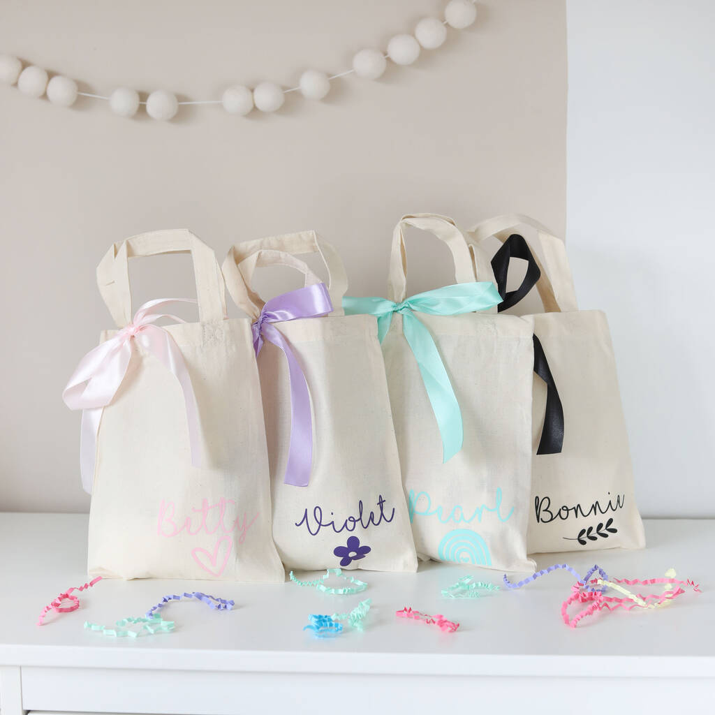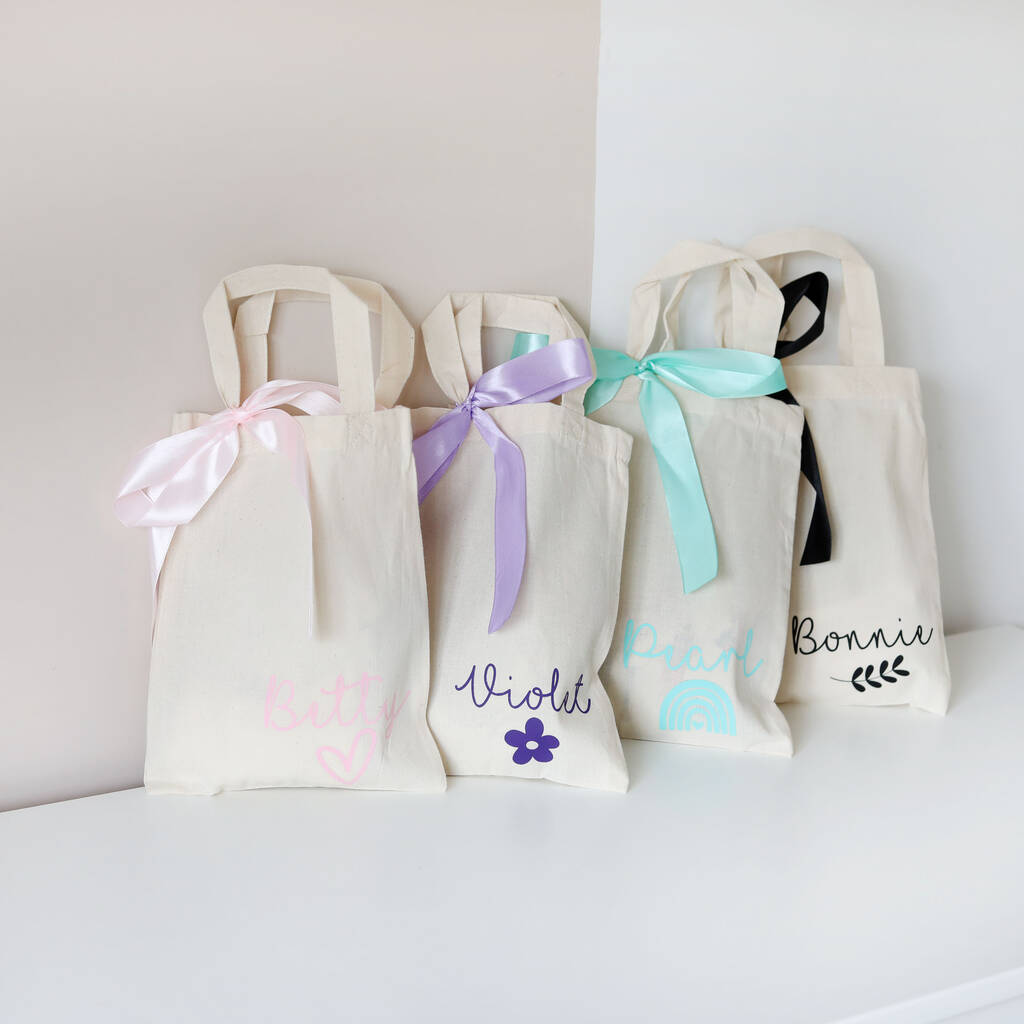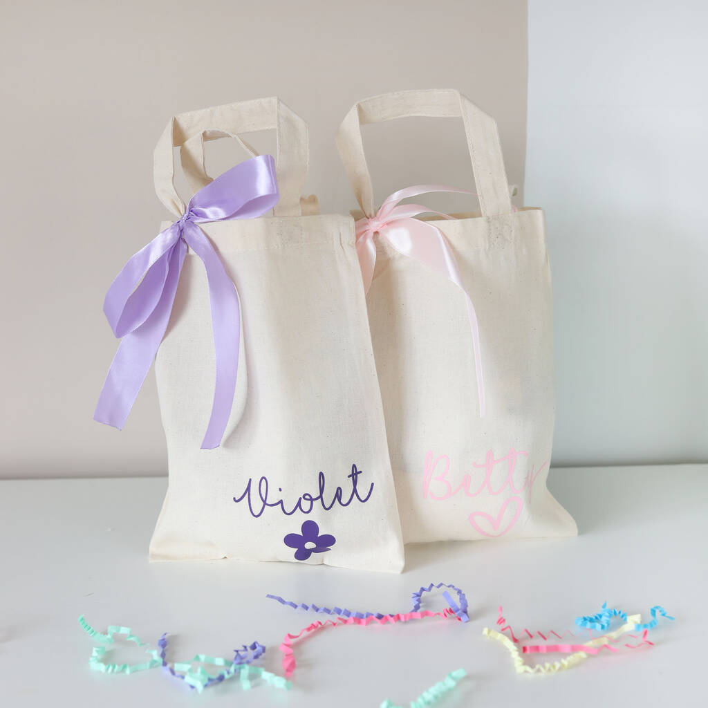 Personalised cotton party bags with ribbon, perfect custom name favour bags for birthdays, weddings, bridesmaids, and special occasions.