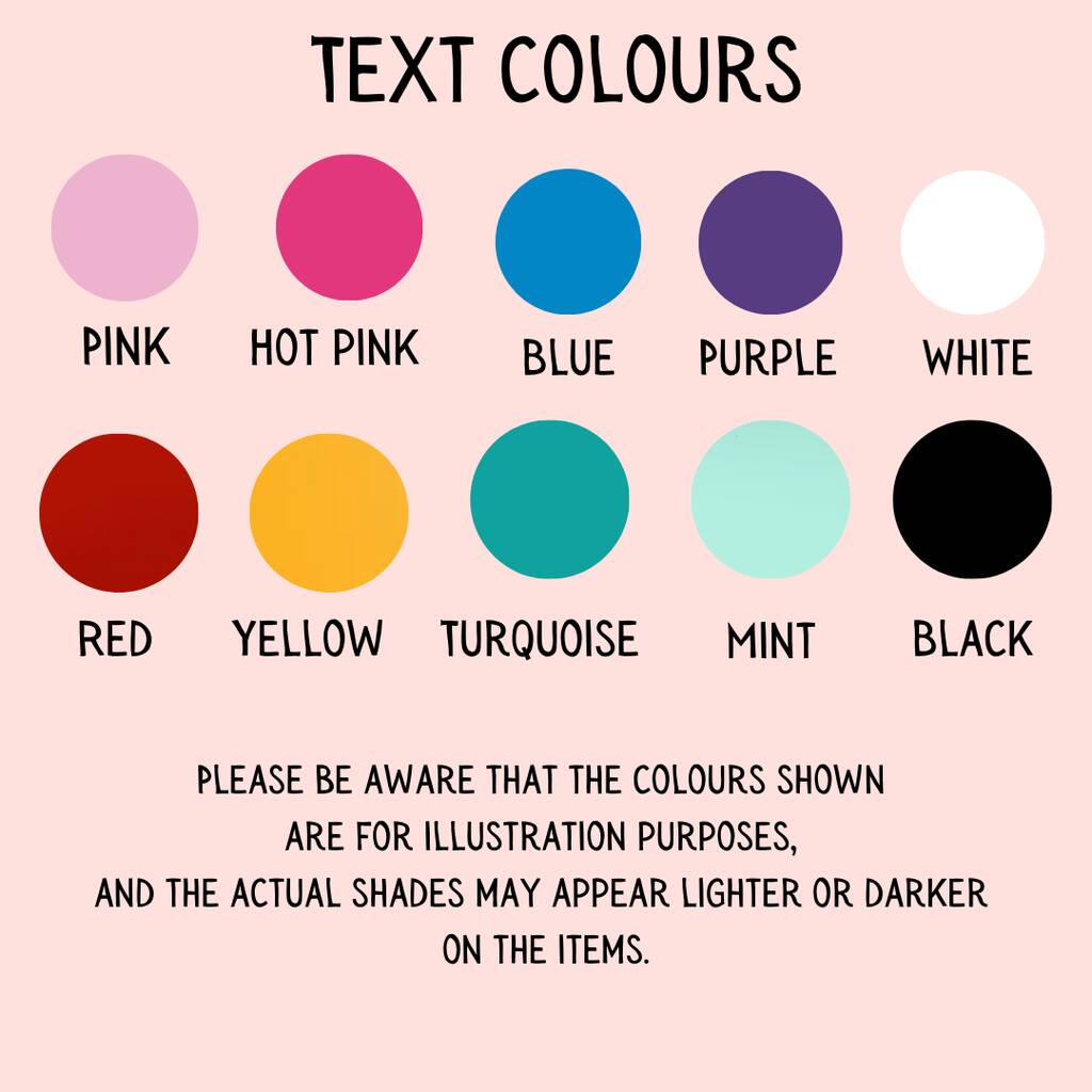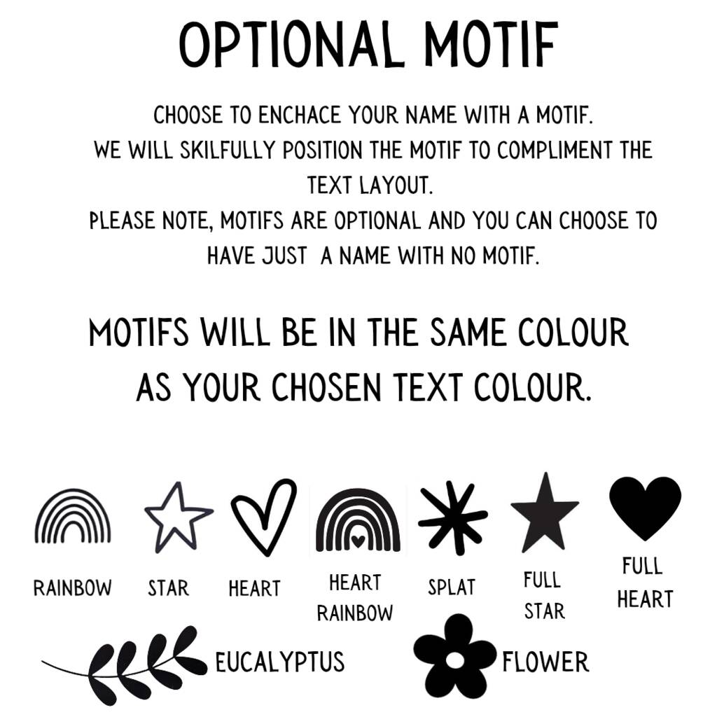 PERSONALISATION Choose your preferred text colour and optional motif, then personalise with a single name in the box provided. (Single names only; no double names due to space.) The ribbon is optional and will match your selected text colour.