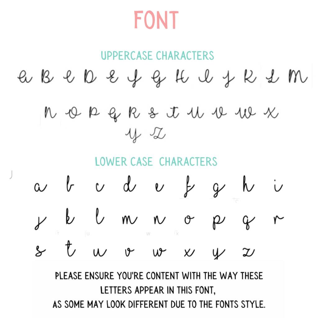 Please check the font and make sure your content with how your name will appear in the font as some letters may look different due to the fonts style. Font can be found on the images.