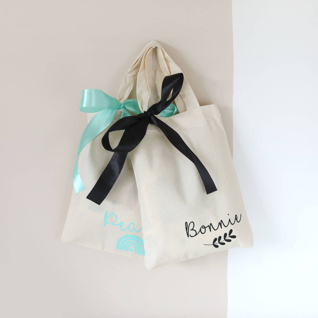 Make every celebration extra special with our personalised cotton party bags, finished with a beautiful ribbon tie and customised with a name of your choice. These delightful cotton favour bags add a thoughtful touch to any occasion.
