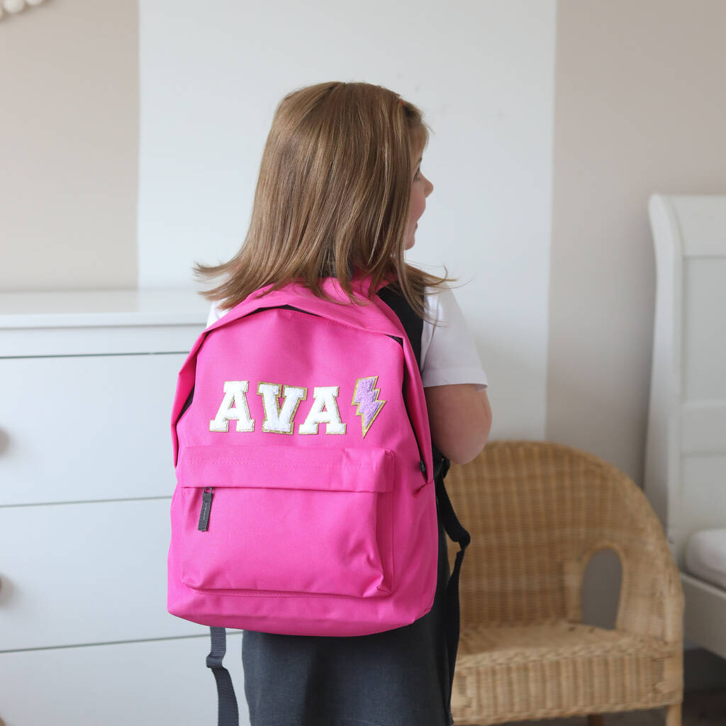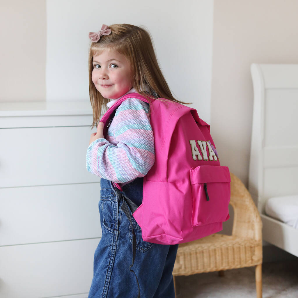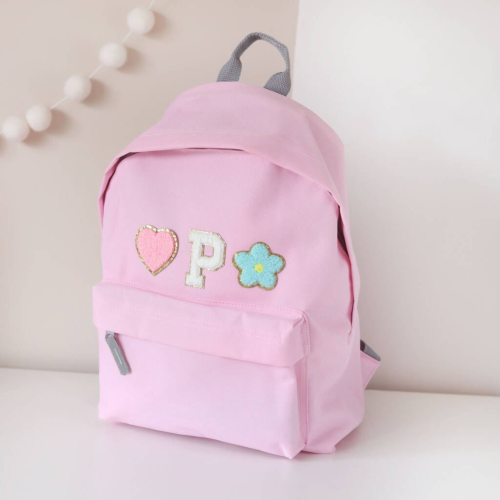 Personalised kids backpack with chenille letters and fun motifs—custom school and nursery bag, perfect children’s gift for birthdays, preschool, primary, and everyday adventures.