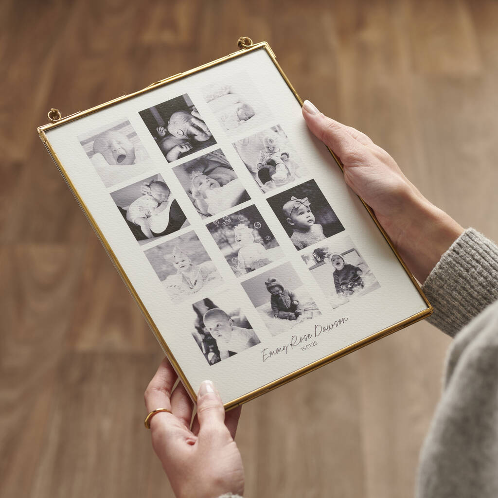 Celebrate your baby’s first year with this personalised baby photo frame, a timeless keepsake perfect for a first birthday present. The elegant brass frame, measuring 20cm x 25cm, holds 12 photos to capture each milestone from birth to their first birthday.
