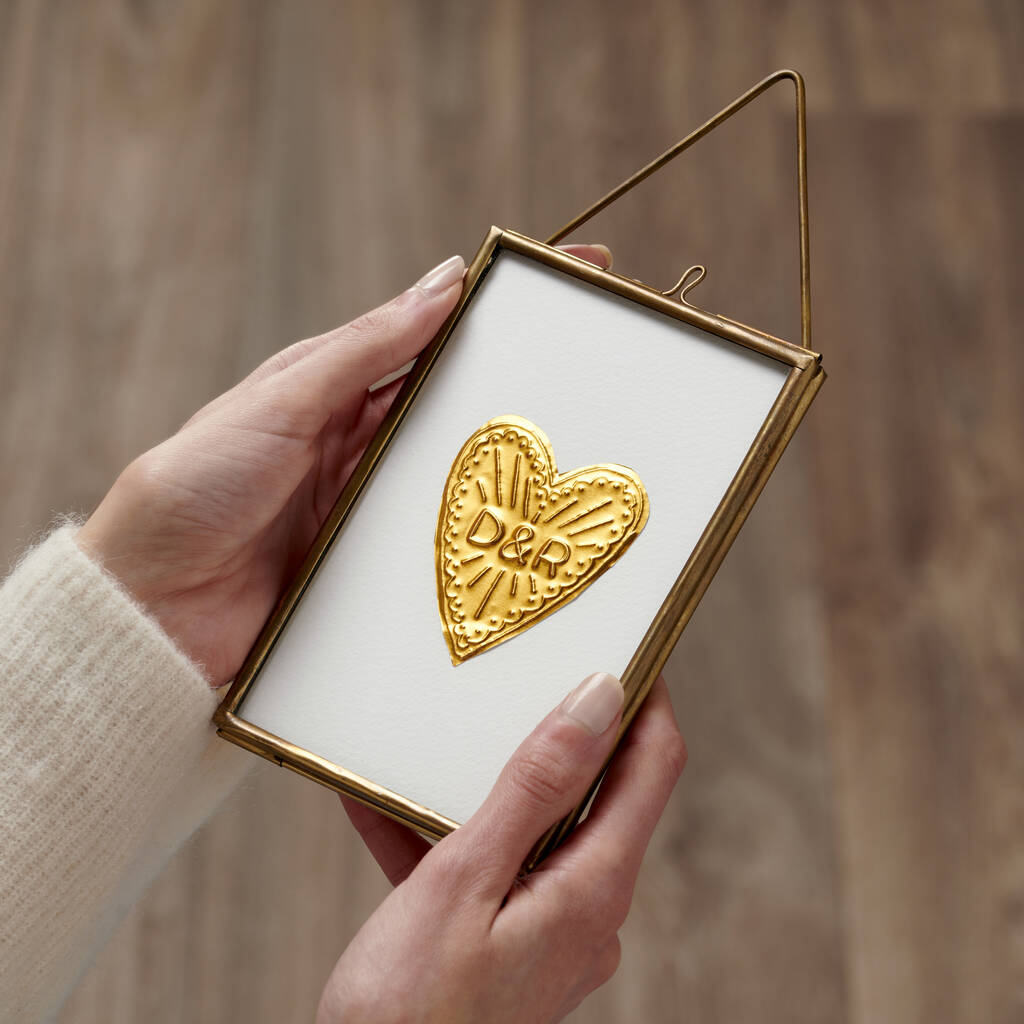Handmade and full of meaning, this personalised brass heart hanging frame is a timeless keepsake designed to celebrate life’s most special moments. Engagements, Birthdays and Weddings. Each piece features a hand-embossed brass heart, carefully personalised with your chosen initials and displayed within an elegant glass hanging frame. Crafted slowly and thoughtfully by our talented team in Brighton, every frame has its own subtle character, making each one truly unique.