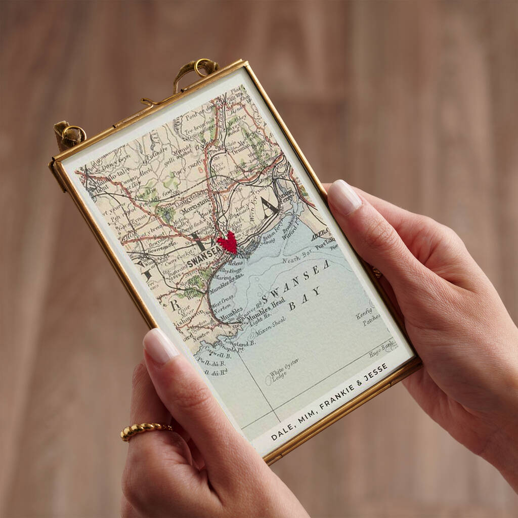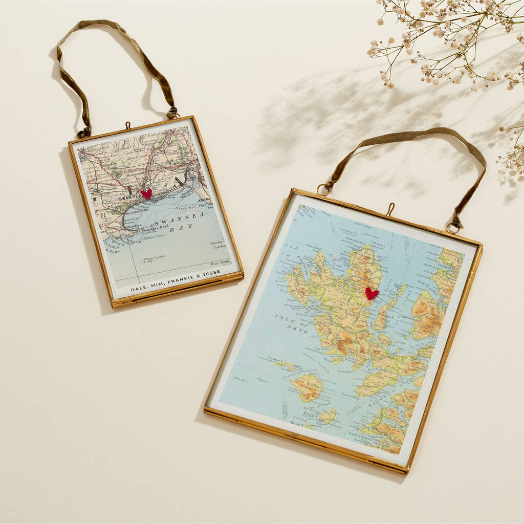A gorgeous Personalised Family Vintage Map Picture with a hand stitched red heart. A wonderfully thoughtful Christmas gift showing their most treasured place.