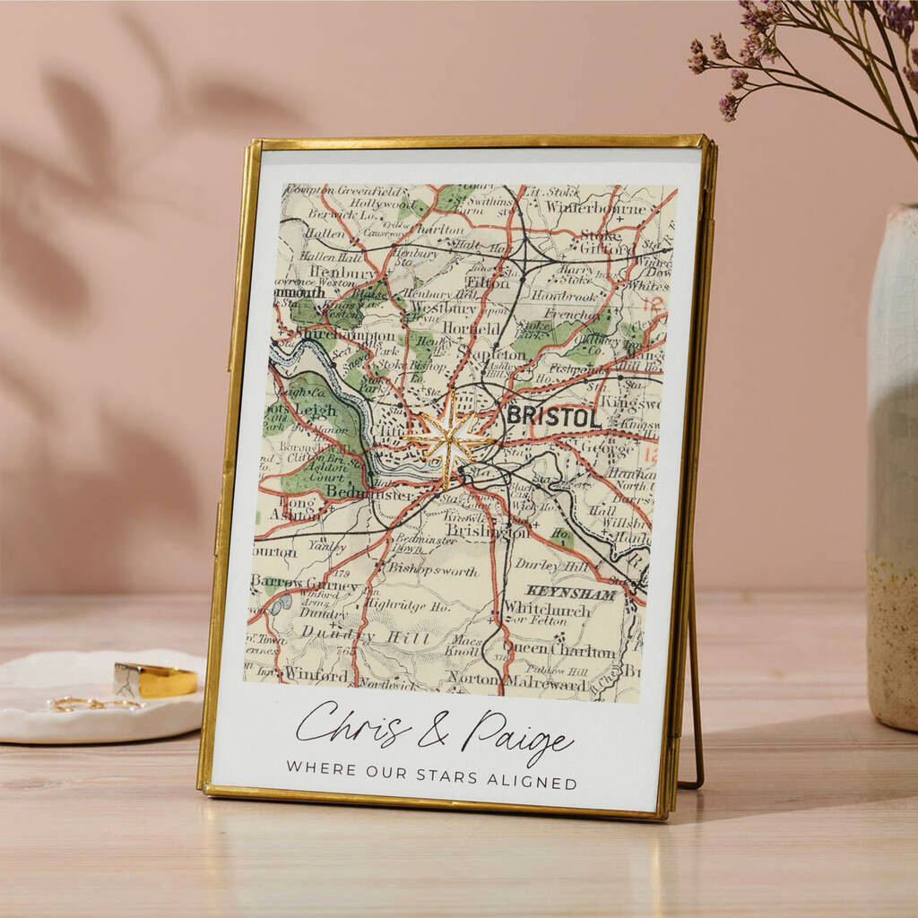 A beautiful vintage map print marking your special place with a hand stitched golden star. Making the perfect gift for weddings, anniversaries or engagements.