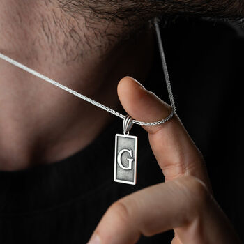 This men’s initial necklace is handcrafted from oxidised 925 sterling silver, offering a bold yet minimalist look. Perfect for birthdays, anniversaries, or Father’s Day, it’s a meaningful gift he’ll wear daily. The rectangular pendant frames your chosen initial in raised lettering, giving it a modern, masculine appeal. Designed for everyday wear and ethically produced with care, this necklace blends craftsmanship with style.
