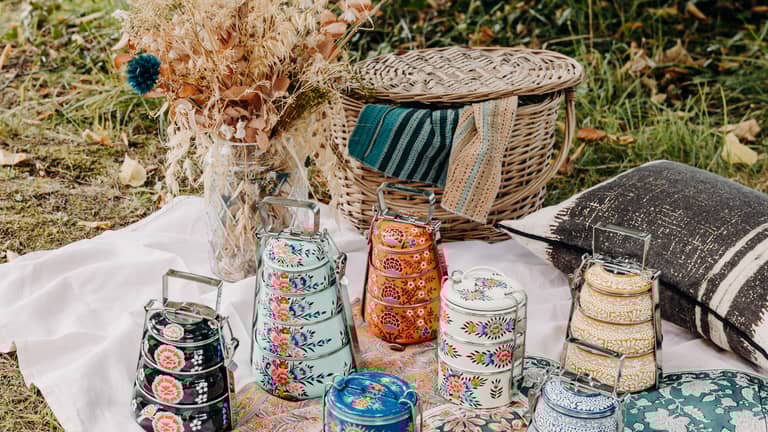 Beautiful Tiffin Lunch Boxes, Bento Boxes, Spice Tins and picnicware. Hand Painted in India. Ideal for lunch on the go, alfresco dining and wild adventures!