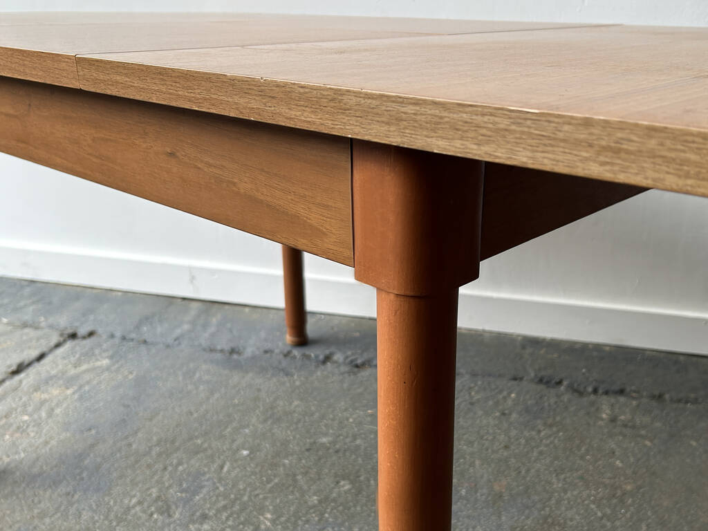 Schreiber Furniture was one of the biggest names in furniture in the 1970s rivalling G Plan and othermanufacturers. They had 280 stores throughout the UK.This is a large Schreiber extendable dining table featuring a rectangular top with curved corners. The table is finished with Schreiber’s trade mark wood-effect Formica.