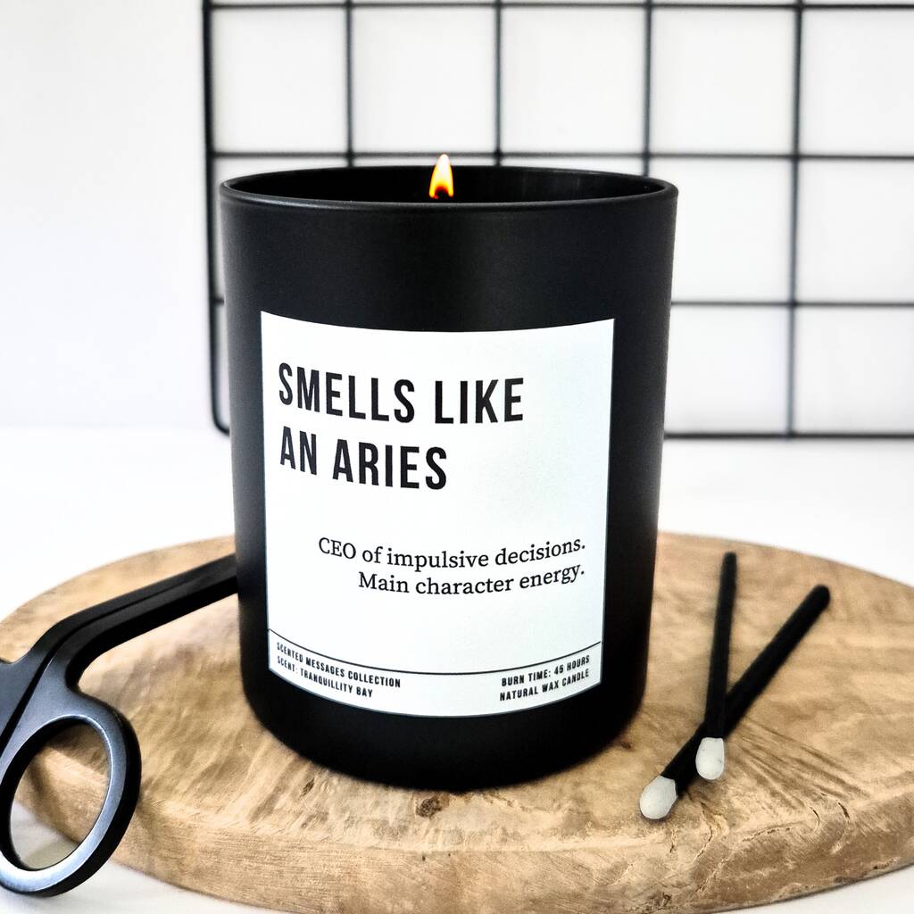 Personalised Aries zodiac candle with custom label text, a bold and playful astrology candle gift made to order for birthdays and star sign lovers.