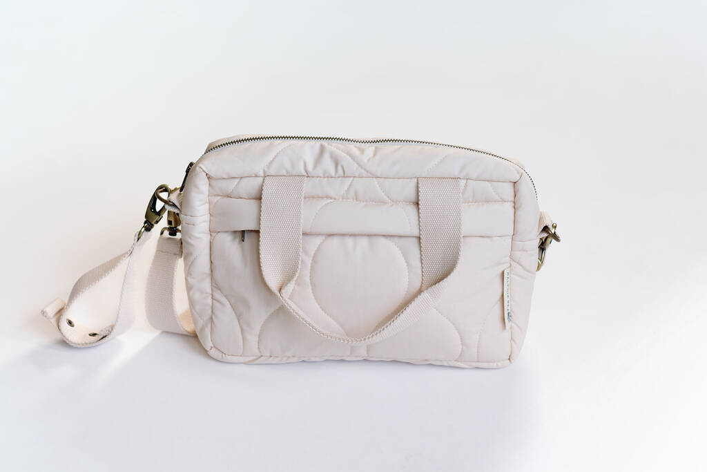 A spacious changing bag (size: 32 x 20 x 10 cm) with room for a portable changing mat, baby wipes, nappies and baby changing essentials. A zipped outer pocket to keep personal items close to hand and 4 internal pockets - 1 zipped inner pocket, 2 internal compartments plus another internal bottle compartment to keep all of your belongings organised and easy to find. With spacious compartments, wipe-clean lining, and a soft neutral finish, it’s as practical as it is beautiful. Whether clipped to your stroller or slung over your shoulder, it keeps nappies, snacks, and essentials right where you need them without compromising on style.