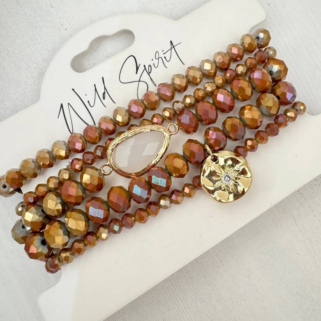 Featuring a mix of textures, faceted beads, and a gold-plated round charm, it's the perfect blend of everyday luxe and golden-hour glamour.