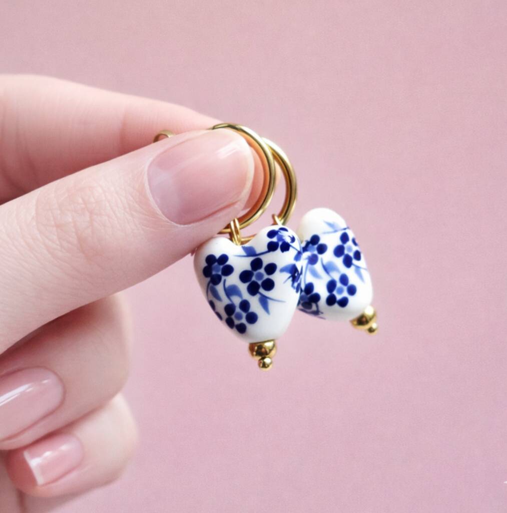 Blue And White Ceramic Heart Hoop Earrings Delftware Inspired