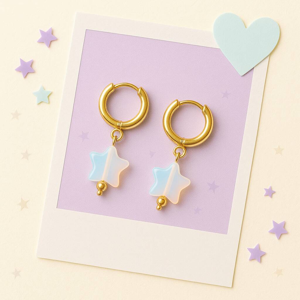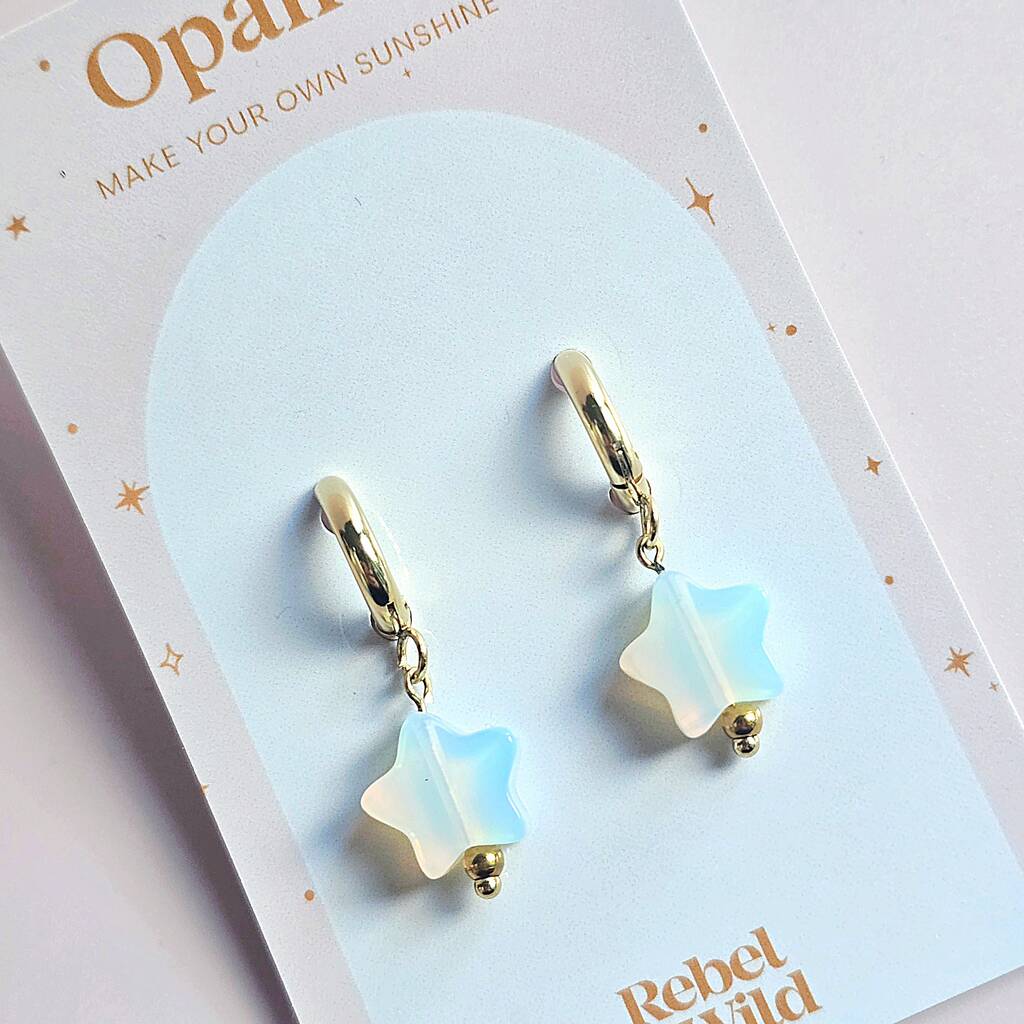 Dreamy opalite star huggie earrings inspired by soft, uplifting Taylor coded aesthetics. A subtle sparkle for everyday magic.