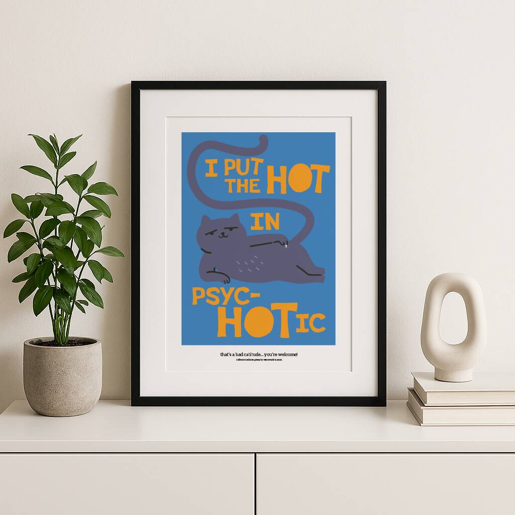 Bad Catitude, a mischievous, grumpy cartoon cat print with attitude, perfect modern wall art for cat lovers, adding humour, sass, and personality to any space.Bring fun and attitude to your walls with the Bad Catitude print. Featuring a naughty, grumpy cartoon cat, this bold modern design adds humour and personality to any room. Ideal for cat lovers or anyone who enjoys playful, stylish artwork. Printed in vibrant colors, it’s a statement piece that sparks smiles.