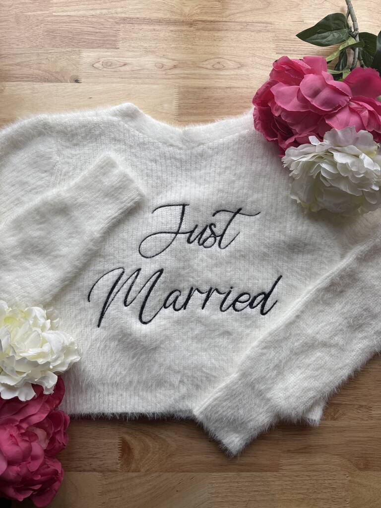 Crafted from soft knitted fabric, this sweatshirt features the words "Just Married" in high quality black thread, finished with pearl buttons.