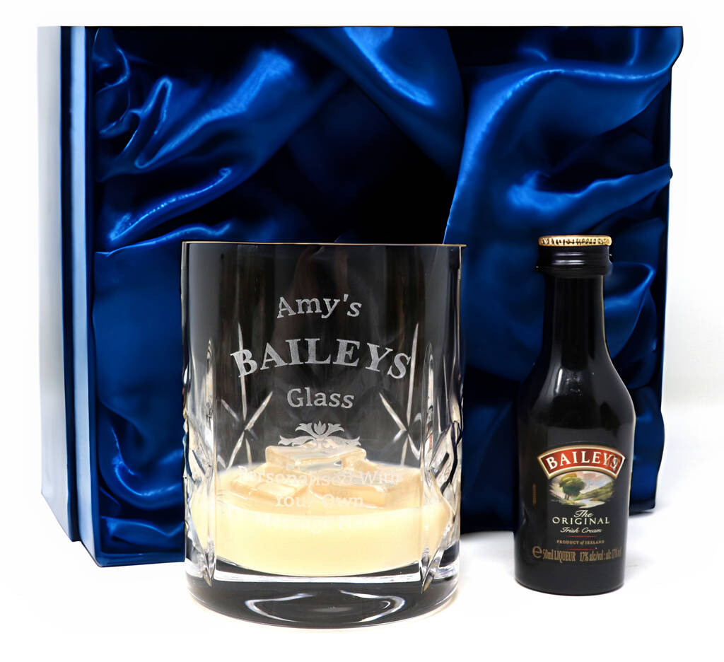 Personalised Baileys Design Crystal Glass Tumbler And Miniature Baileys In Silk Gift Box