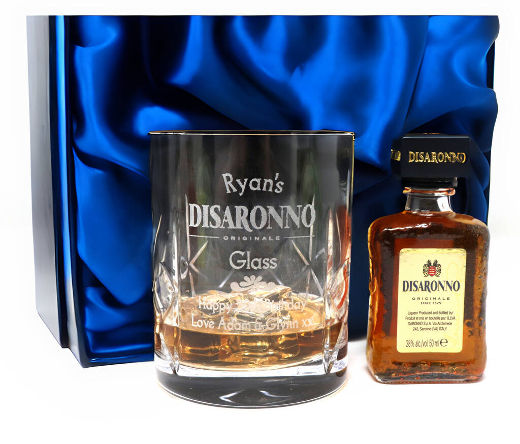 Personalised Disaronno Design Crystal Glass Tumbler And Miniature Disaronno In Silk Gift Box
